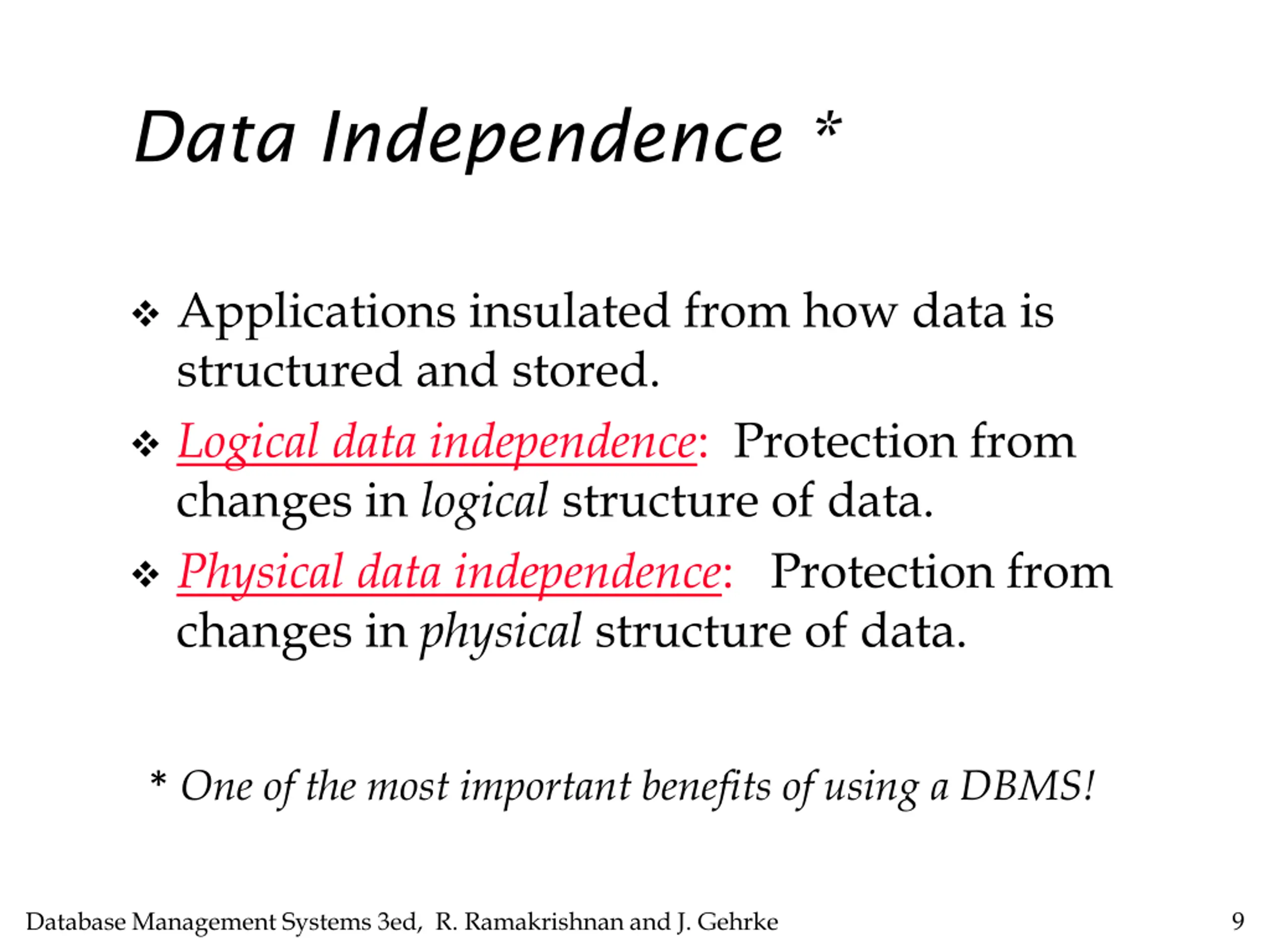 Data Independence * Applications insulated from how data is structured and stored. Logical data independence: Protection from changes in logical structure of data. Physical data independence: Protection from changes in physical structure of data. * One of the most important benefits of using a DBMS! Database Management Systems 3ed, R. Ramakrishnan and J. Gehrke 9