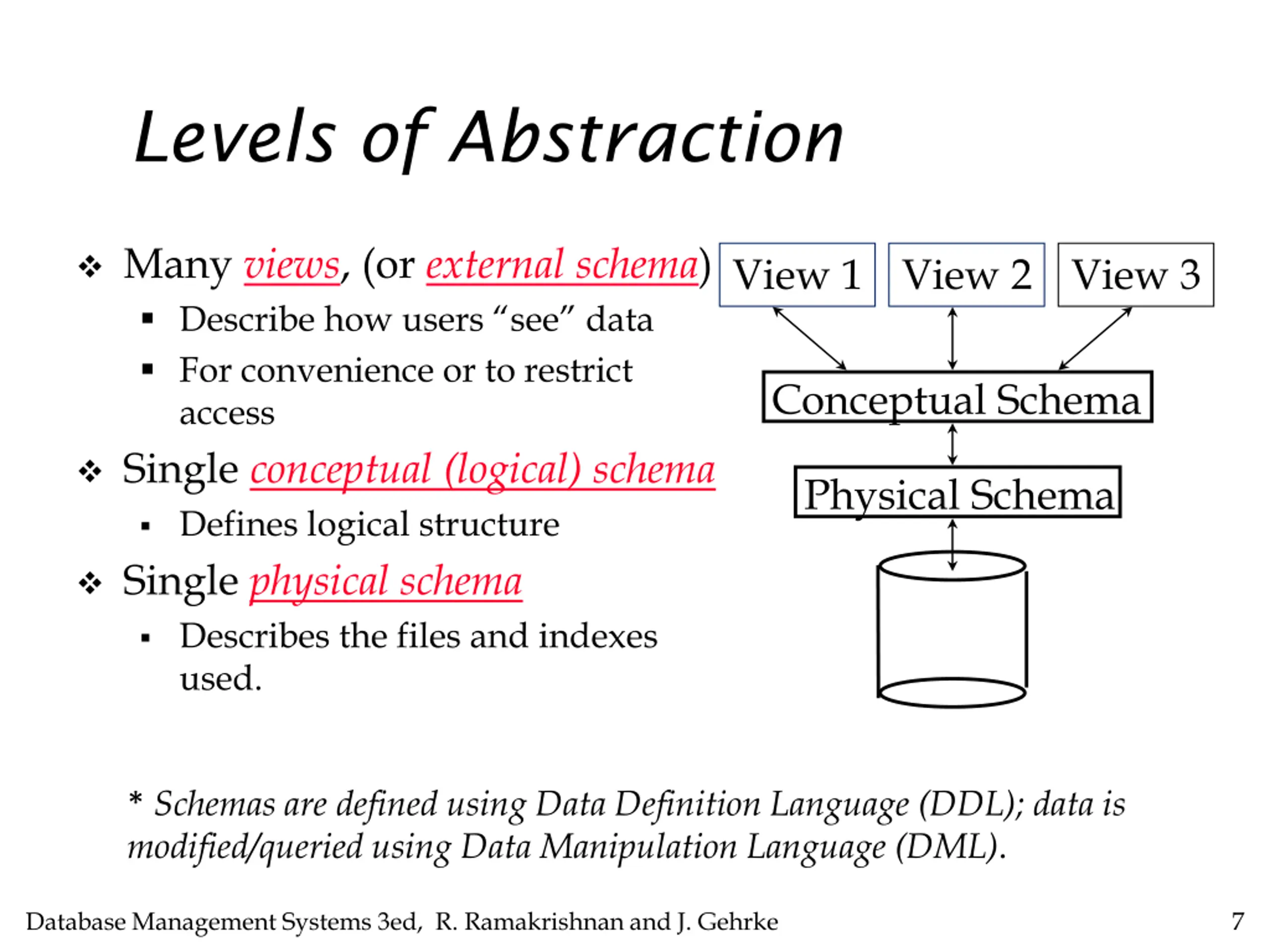 Levels of Abstraction Many views, (or external schema) Describe how users see data For convenience or to restrict access Single conceptual (logical) schema Defines logical structure Single physical schema Describes the files and indexes used. View 1 View 2 View 3 Conceptual Schema Physical Schema * Schemas are defined using Data Definition Language (DDL); data is modified/queried using Data Manipulation Language (DML). Database Management Systems 3ed, R. Ramakrishnan and J. Gehrke 7