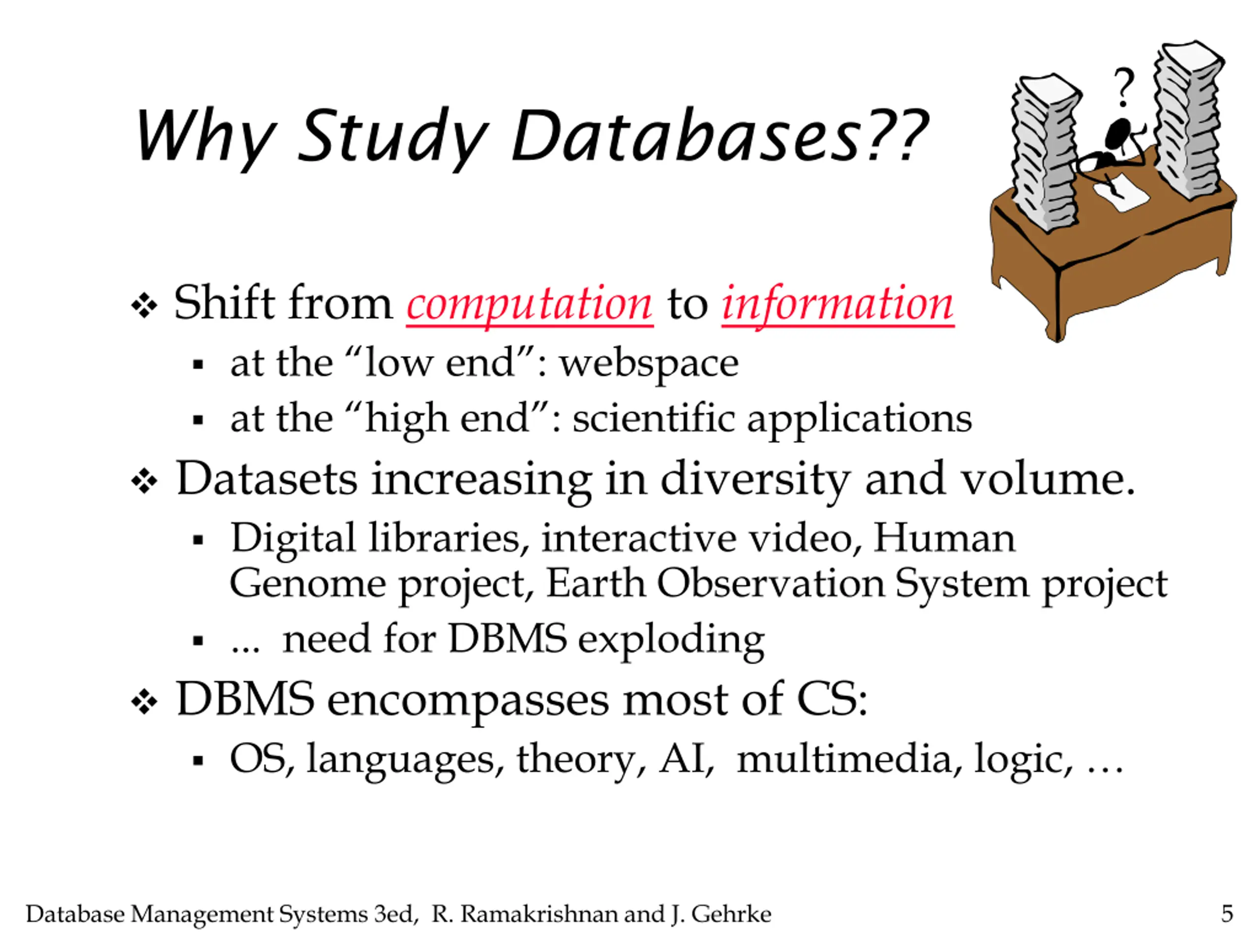 ? Why Study Databases?? Shift from computation to information at the low end : webspace at the high end : scientific applications Datasets increasing in diversity and volume. Digital libraries, interactive video, Human Genome project, Earth Observation System project ... need for DBMS exploding DBMS encompasses most of CS: OS, languages, theory, AI, multimedia, logic, Database Management Systems 3ed, R. Ramakrishnan and J. Gehrke 5