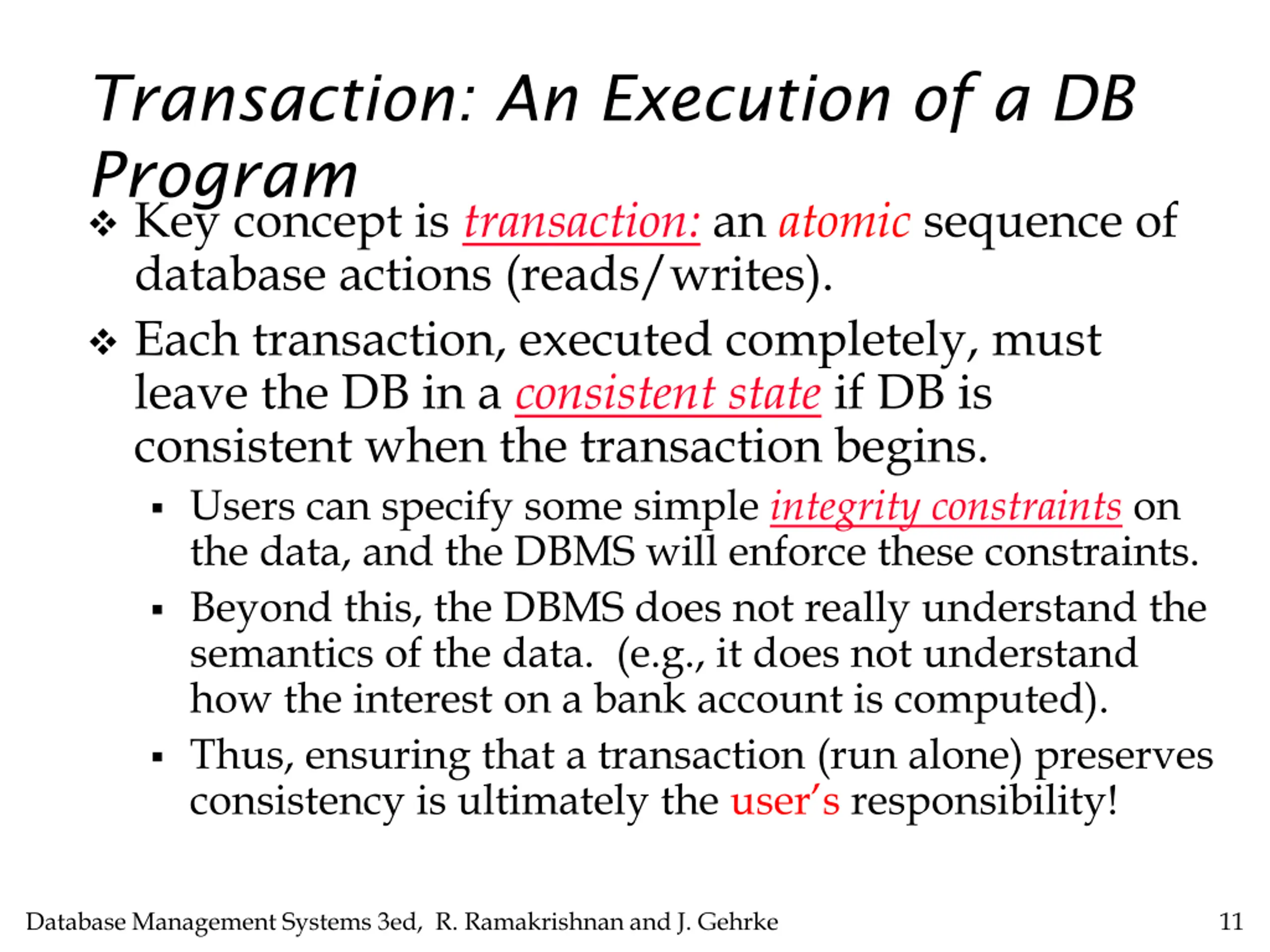 Transaction: An Execution of a DB Program Key concept is transaction: an atomic sequence of database actions (reads/writes). Each transaction, executed completely, must leave the DB in a consistent state if DB is consistent when the transaction begins. Users can specify some simple integrity constraints on the data, and the DBMS will enforce these constraints. Beyond this, the DBMS does not really understand the semantics of the data. (e.g., it does not understand how the interest on a bank account is computed). Thus, ensuring that a transaction (run alone) preserves consistency is ultimately the user s responsibility! Database Management Systems 3ed, R. Ramakrishnan and J. Gehrke 11