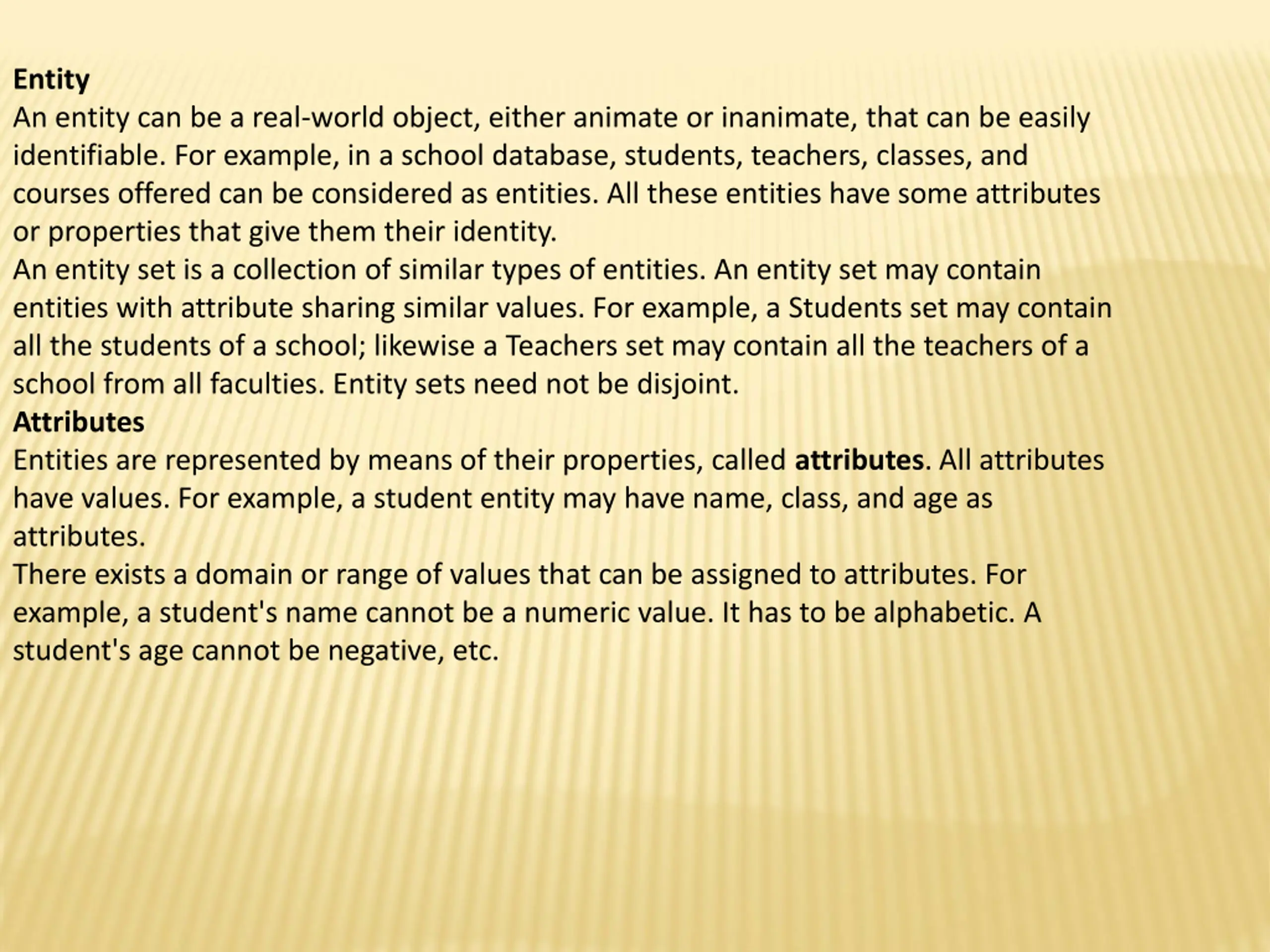 Entity An entity can be a real-world object, either animate or inanimate, that can be easily identifiable. For example, in a school database, students, teachers, classes, and courses offered can be considered as entities. All these entities have some attributes or properties that give them their identity. An entity set is a collection of similar types of entities. An entity set may contain entities with attribute sharing similar values. For example, a Students set may contain all the students of a school; likewise a Teachers set may contain all the teachers of a school from all faculties. Entity sets need not be disjoint. Attributes Entities are represented by means of their properties, called attributes. All attributes have values. For example, a student entity may have name, class, and age as attributes. There exists a domain or range of values that can be assigned to attributes. For example, a student's name cannot be a numeric value. It has to be alphabetic. A student's age cannot be negative, etc.
