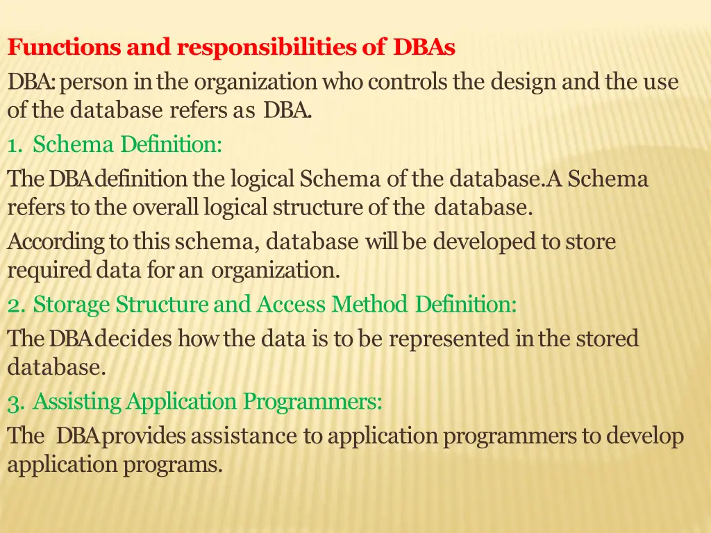 Functions and responsibilities of DBAs DBA: person in the organization who controls the design and the use of the database refers as DBA. 1. Schema Definition: The DBA definition the logical Schema of the database.A Schema refers to the overall logical structure of the database. According to this schema, database will be developed to store required data for an organization. 2. Storage Structure and Access Method Definition: The DBA decides how the data is to be represented in the stored database. 3. Assisting ApplicationProgrammers: The DBA provides assistance to application programmers to develop applicationprograms.
