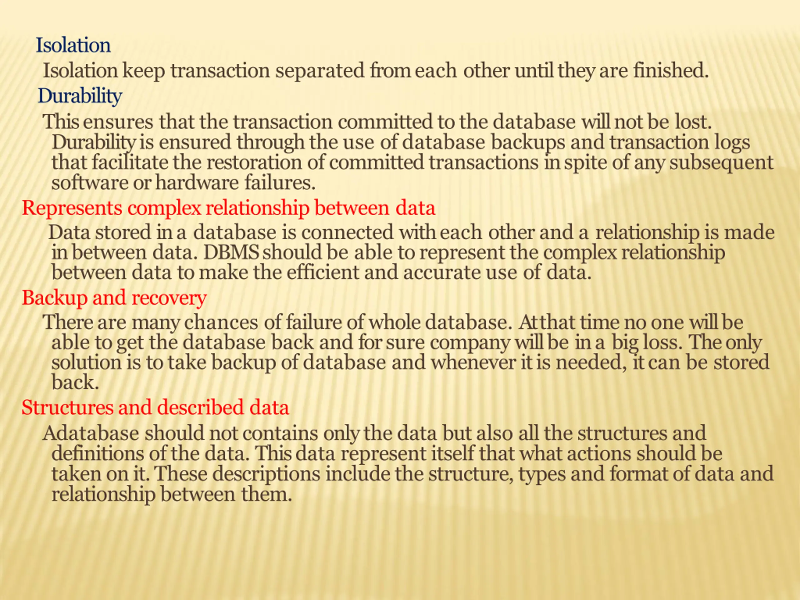 Isolation Isolation keep transaction separated from each other until they are finished. Durability This ensures that the transaction committed to the database will not be lost. Durability is ensured through the use of database backups and transaction logs that facilitate the restoration of committed transactions in spite of any subsequent software or hardware failures. Represents complex relationship between data Data stored in a database is connected with each other and a relationship is made in between data. DBMS should be able to represent the complex relationship between data to make the efficient and accurate use of data. Backup and recovery There are many chances of failure of whole database. At that time no one will be able to get the database back and for sure company will be in a big loss. The only solution is to take backup of database and whenever it is needed, it can be stored back. Structures and described data A database should not contains only the data but also all the structures and definitions of the data. This data represent itself that what actions should be taken on it. These descriptions include the structure, types and format of data and relationship between them.