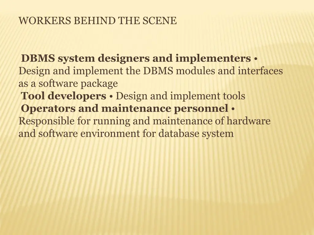 WORKERS BEHIND THE SCENE DBMS system designers and implementers Design and implement the DBMS modules and interfaces as a software package Tool developers Design and implement tools Operators and maintenance personnel Responsible for running and maintenance of hardware and software environment for database system