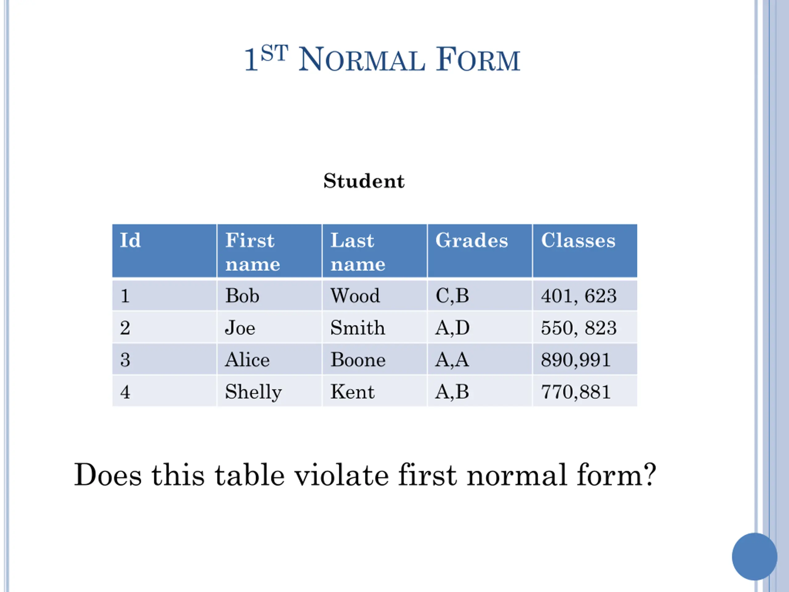 1ST NORMAL FORM Student Id First name Bob Joe Alice Shelly Last name Wood Smith Boone Kent Grades Classes 1 2 3 4 C,B A,D A,A A,B 401, 623 550, 823 890,991 770,881 Does this table violate first normal form?