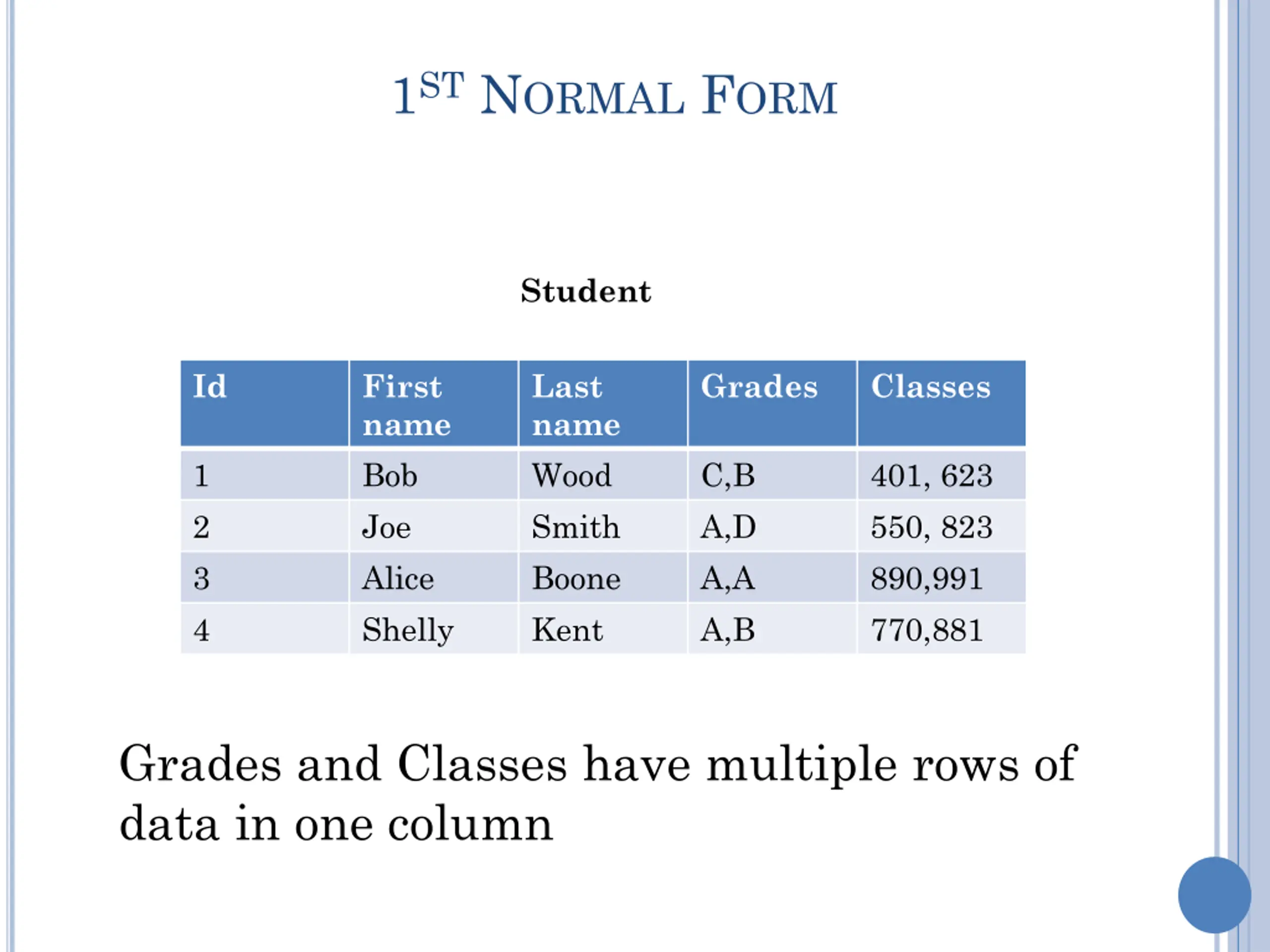 1ST NORMAL FORM Student Id First name Bob Joe Alice Shelly Last name Wood Smith Boone Kent Grades Classes 1 2 3 4 C,B A,D A,A A,B 401, 623 550, 823 890,991 770,881 Grades and Classes have multiple rows of data in one column