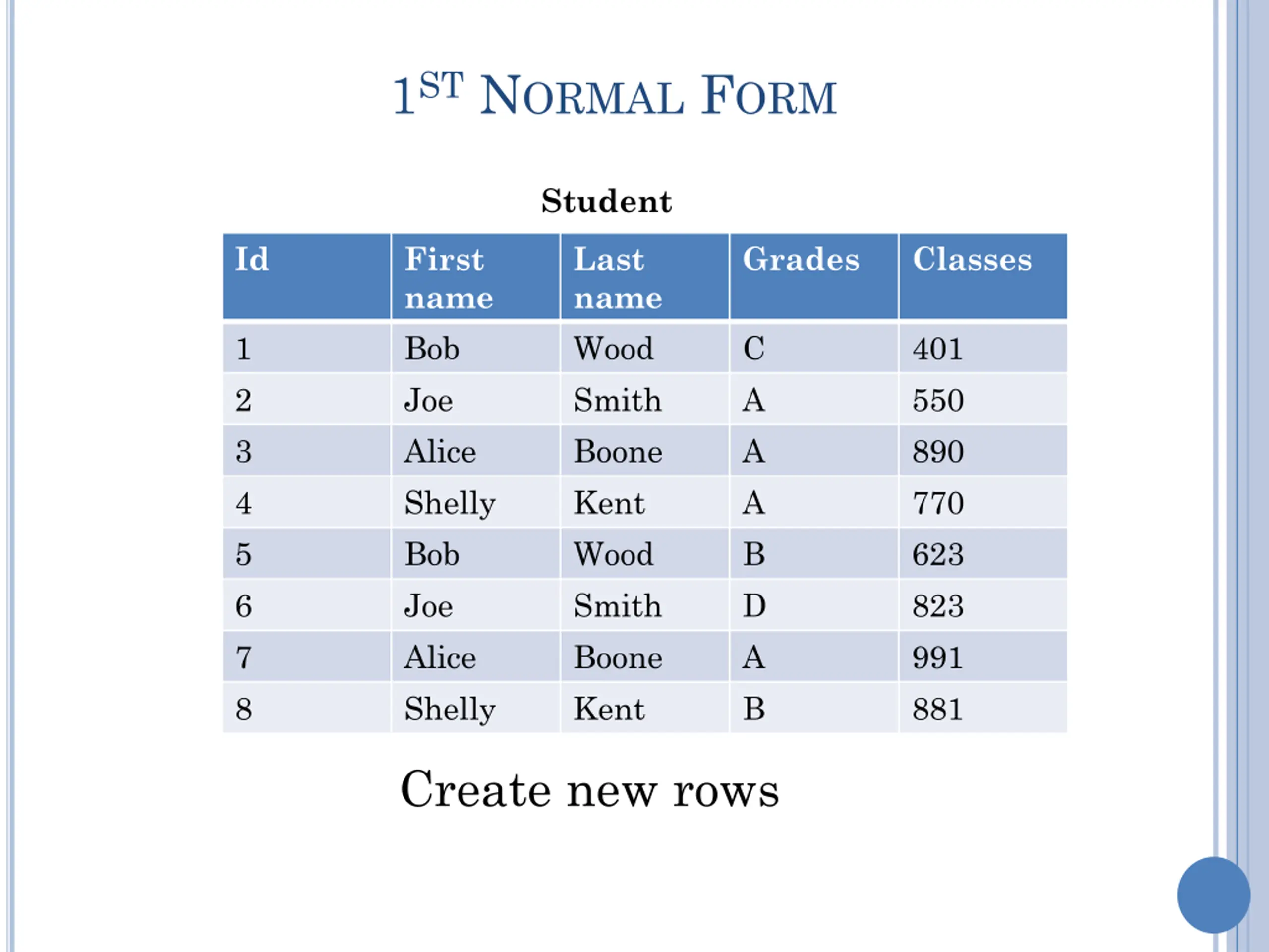 1ST NORMAL FORM Student Id First name Bob Joe Alice Shelly Bob Joe Alice Shelly Last name Wood Smith Boone Kent Wood Smith Boone Kent Grades Classes 1 2 3 4 5 6 7 8 C A A A B D A B 401 550 890 770 623 823 991 881 Create new rows