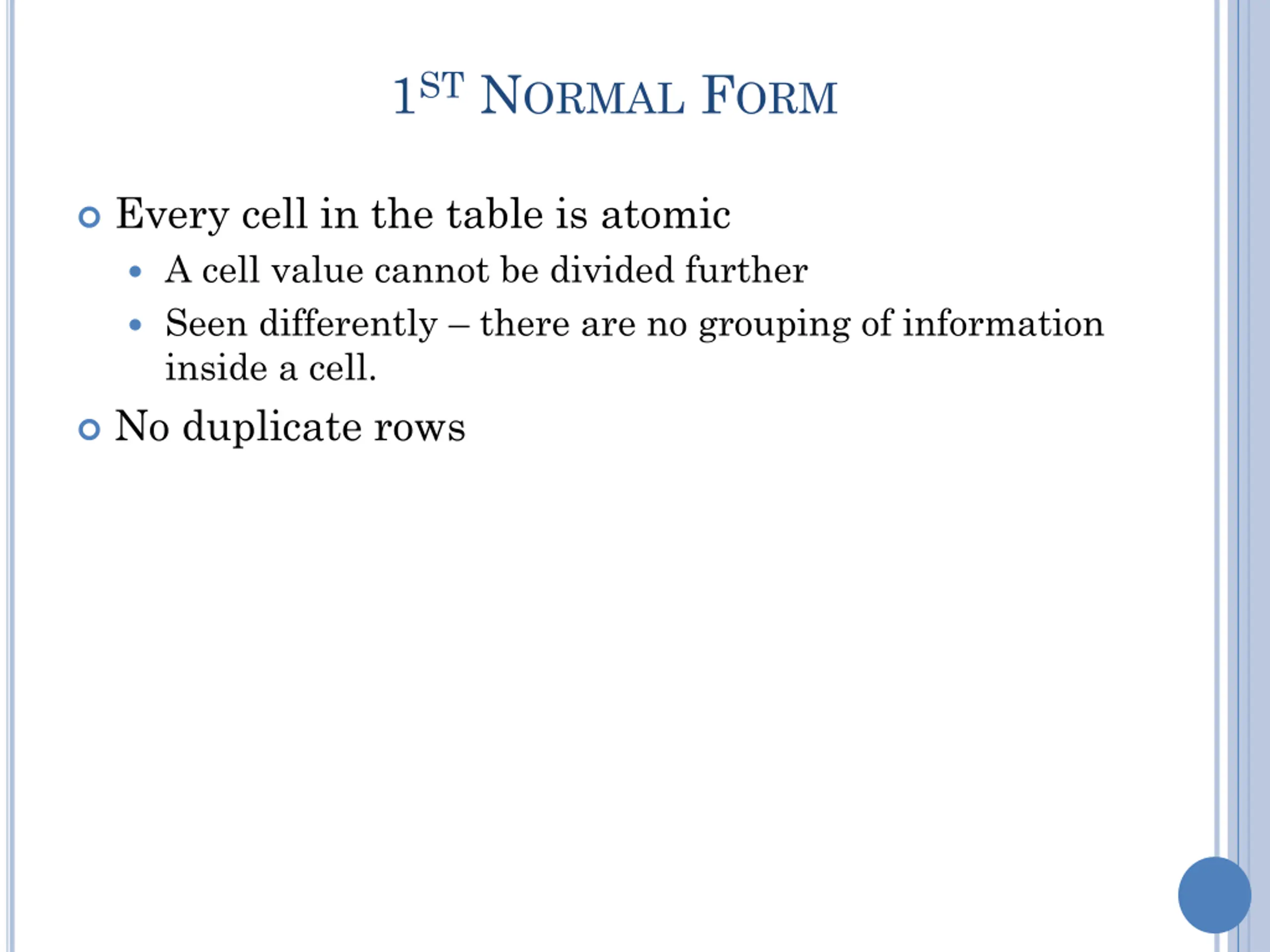 1ST NORMAL FORM Every cell in the table is atomic A cell value cannot be divided further Seen differently there are no grouping of information inside a cell. No duplicate rows