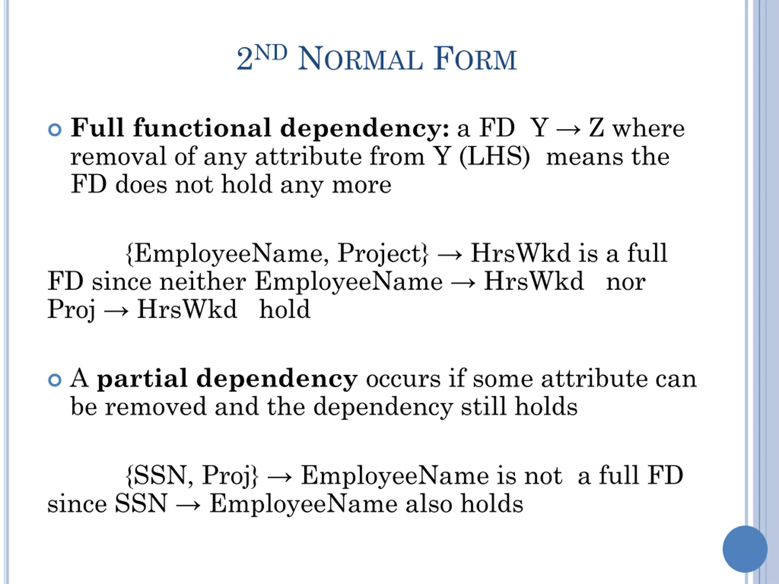 2ND NORMAL FORM Full functional dependency:a FD Y Z where removal of any attribute from Y (LHS) means the FD does not hold any more FD since neither EmployeeName HrsWkd nor Proj HrsWkd hold {EmployeeName, Project} HrsWkd is a full A partial dependency occurs if some attribute can be removed and the dependency still holds since SSN EmployeeName also holds {SSN, Proj} EmployeeName is not a full FD
