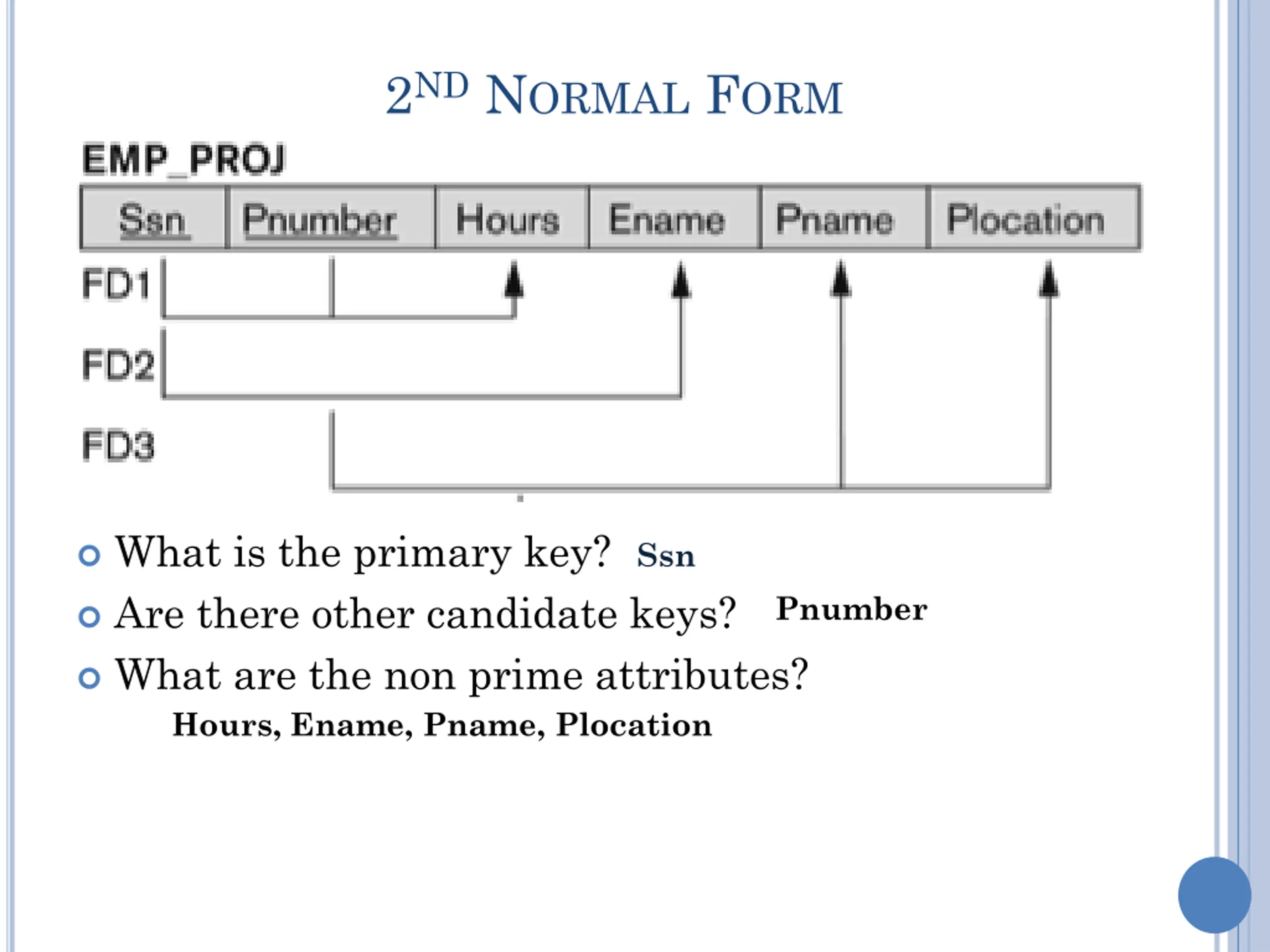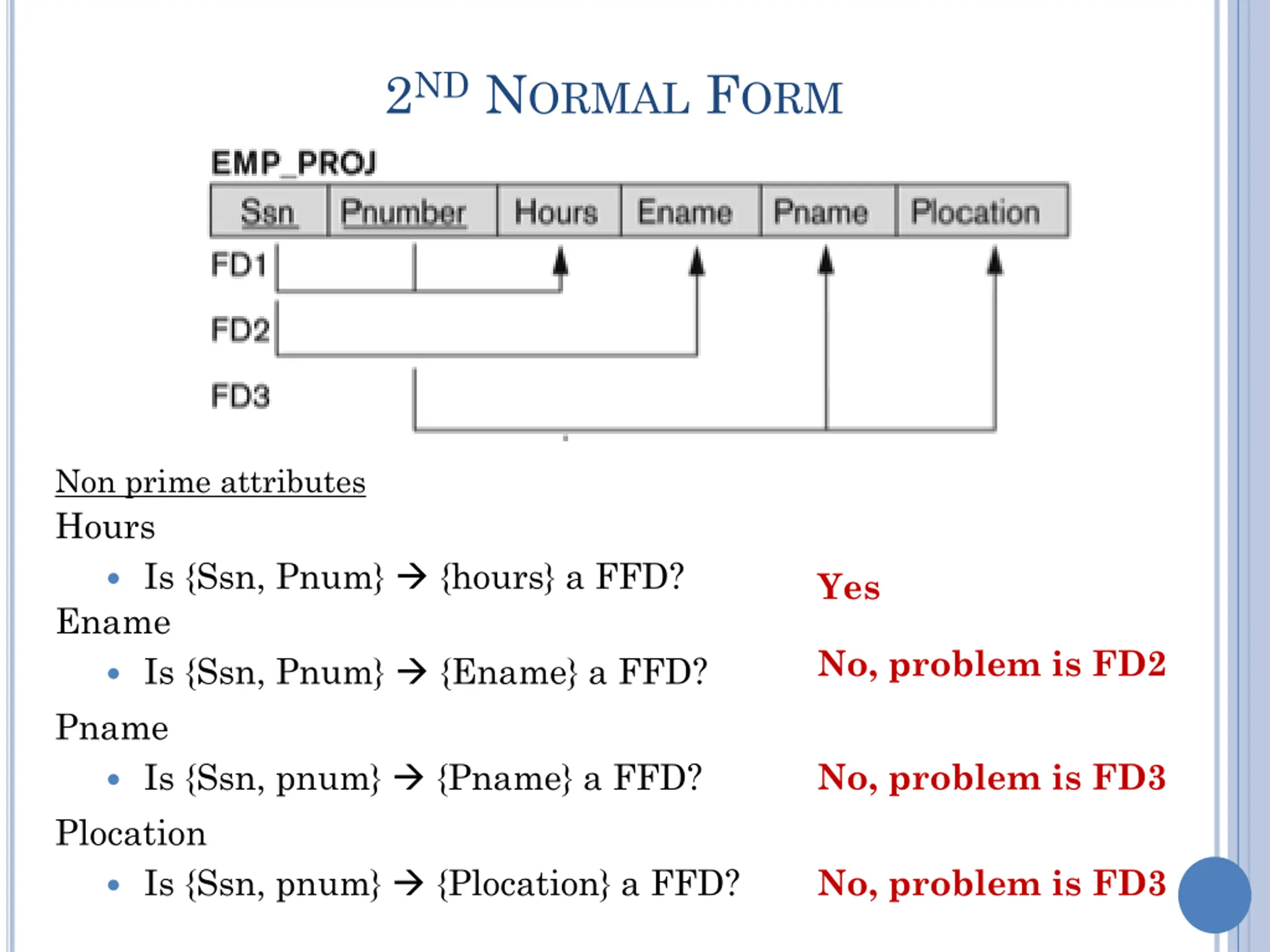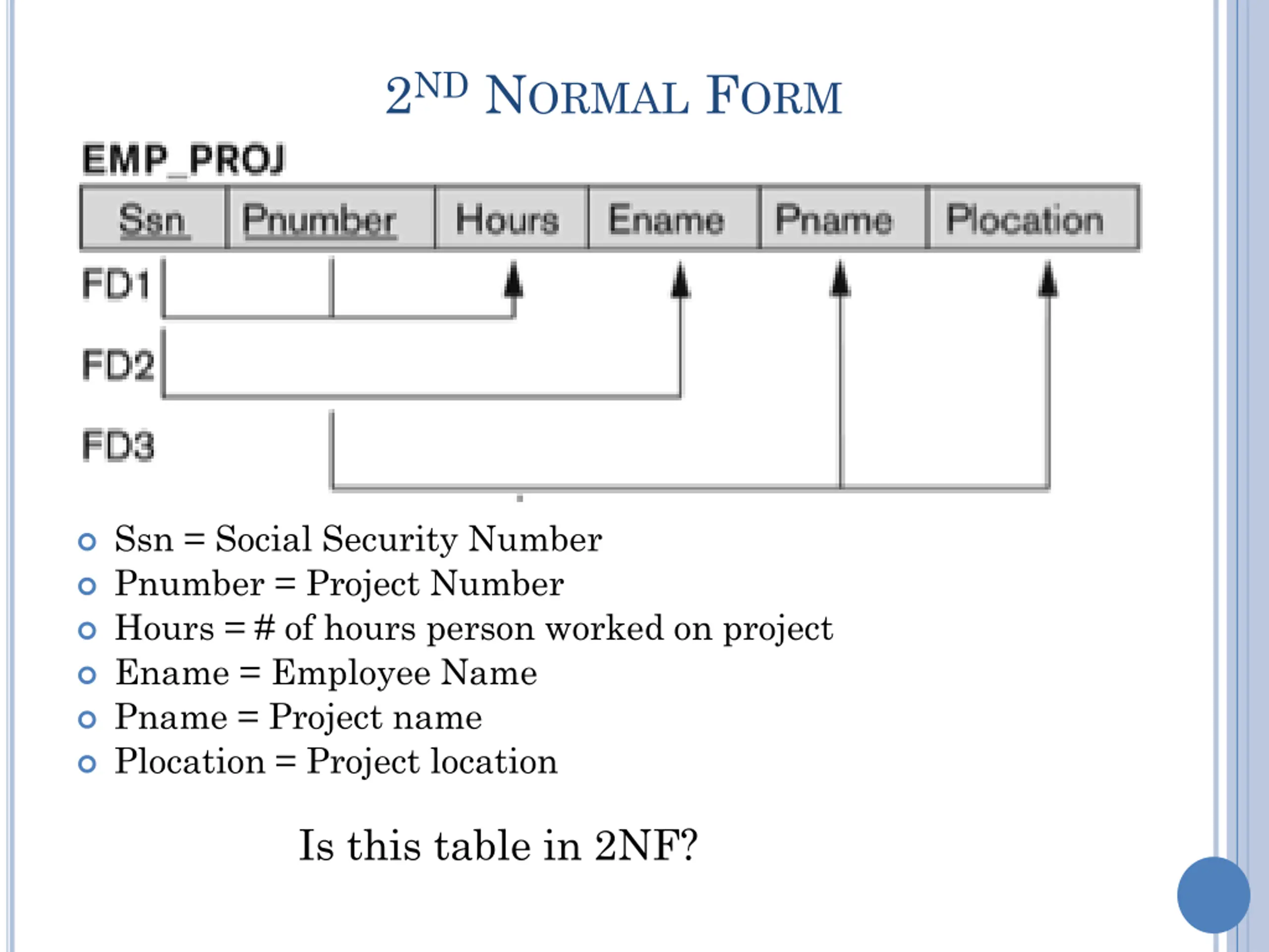 2ND NORMAL FORM Ssn = Social Security Number Pnumber = Project Number Hours = # of hours person worked on project Ename = Employee Name Pname = Project name Plocation = Project location Is this table in 2NF?
