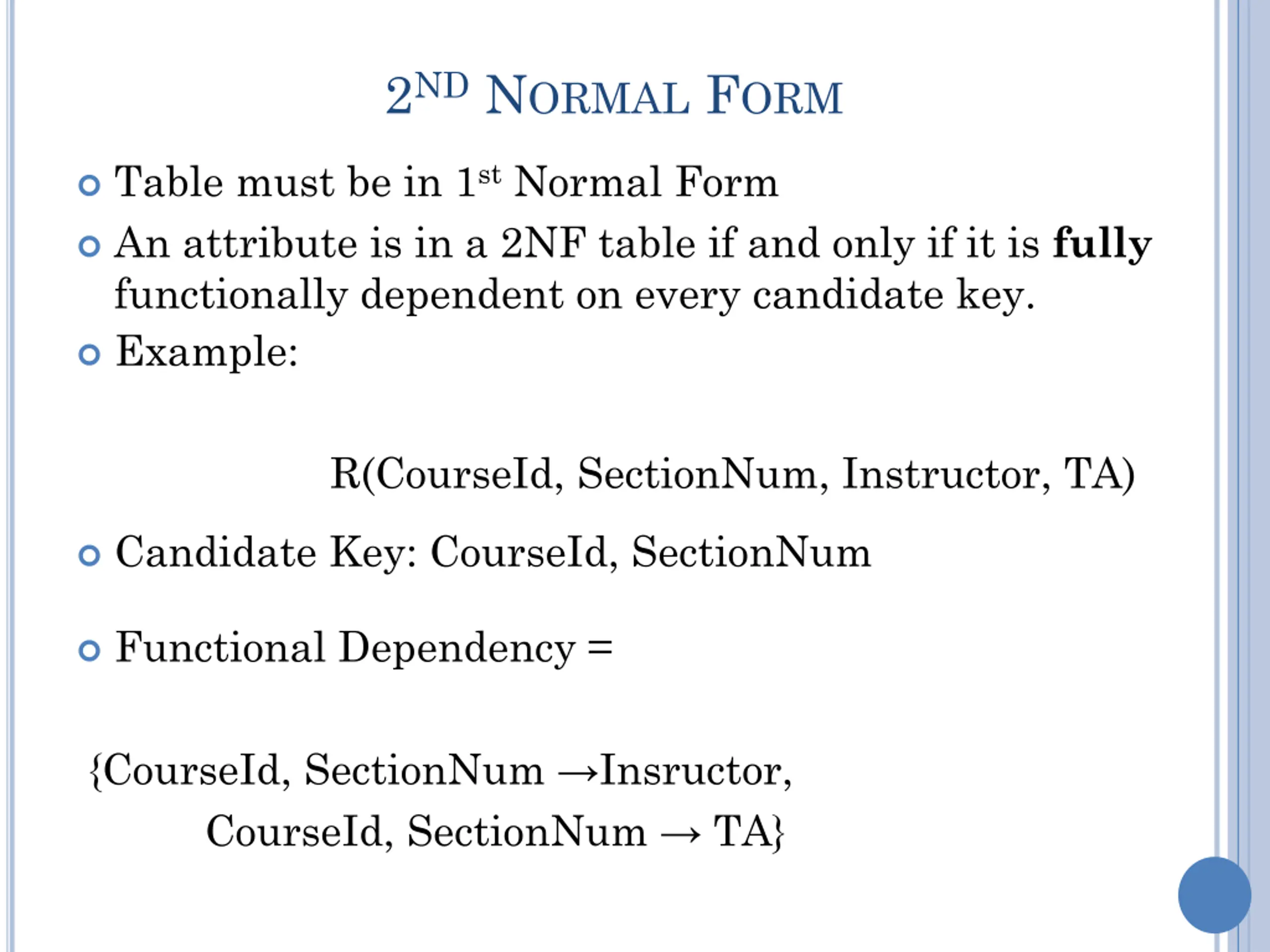 2ND NORMAL FORM Table must be in 1st Normal Form An attribute is in a 2NF table if and only if it is fully functionally dependent on every candidate key. Example: R(CourseId, SectionNum, Instructor, TA) Candidate Key: CourseId, SectionNum Functional Dependency = {CourseId, SectionNum Insructor, CourseId, SectionNum TA}
