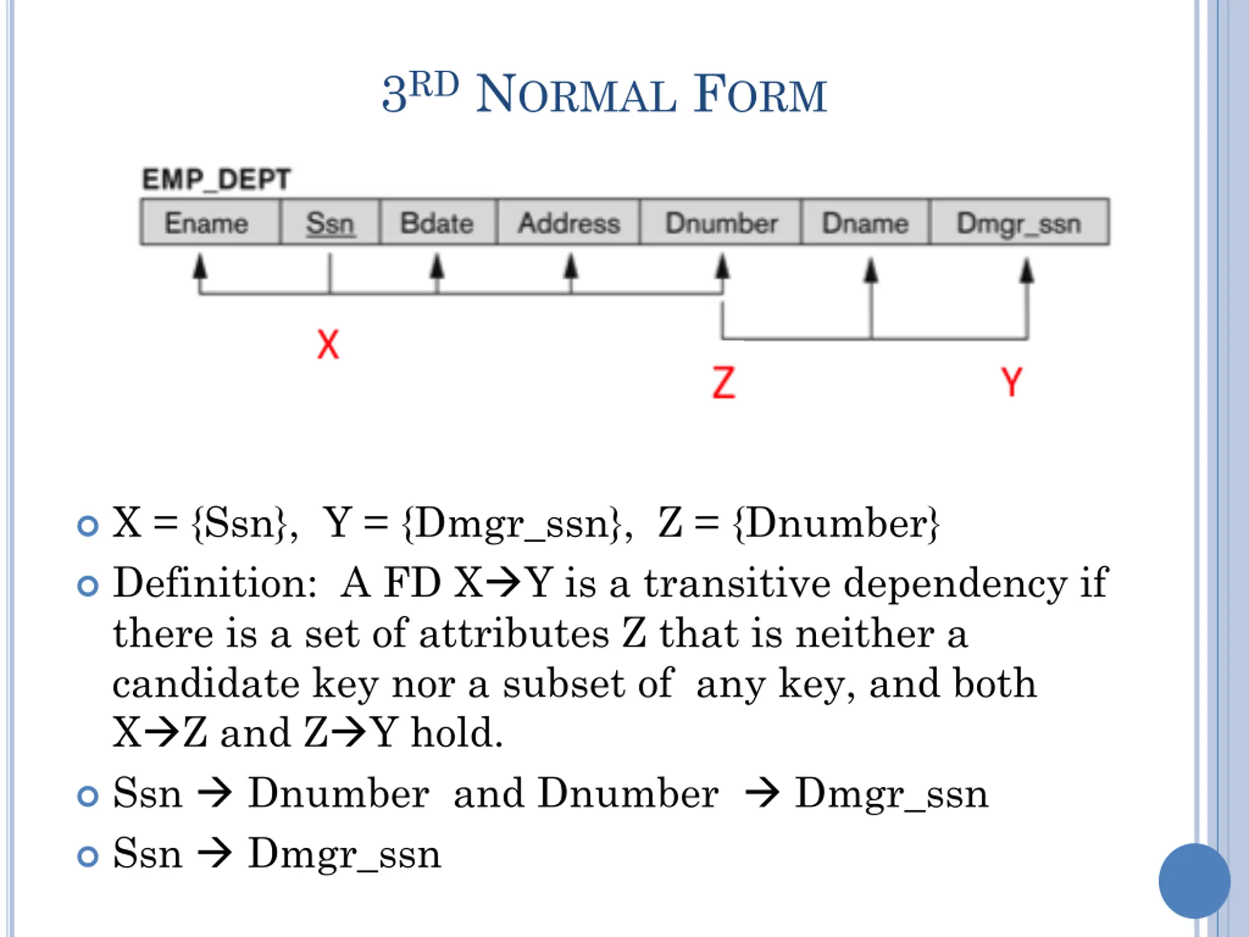 3RD NORMAL FORM X = {Ssn}, Y = {Dmgr_ssn}, Z = {Dnumber} Definition: A FD X Y is a transitive dependency if there is a set of attributes Z that is neither a candidate key nor a subset of any key, and both X Z and Z Y hold. Ssn Dnumber and Dnumber Dmgr_ssn Ssn Dmgr_ssn