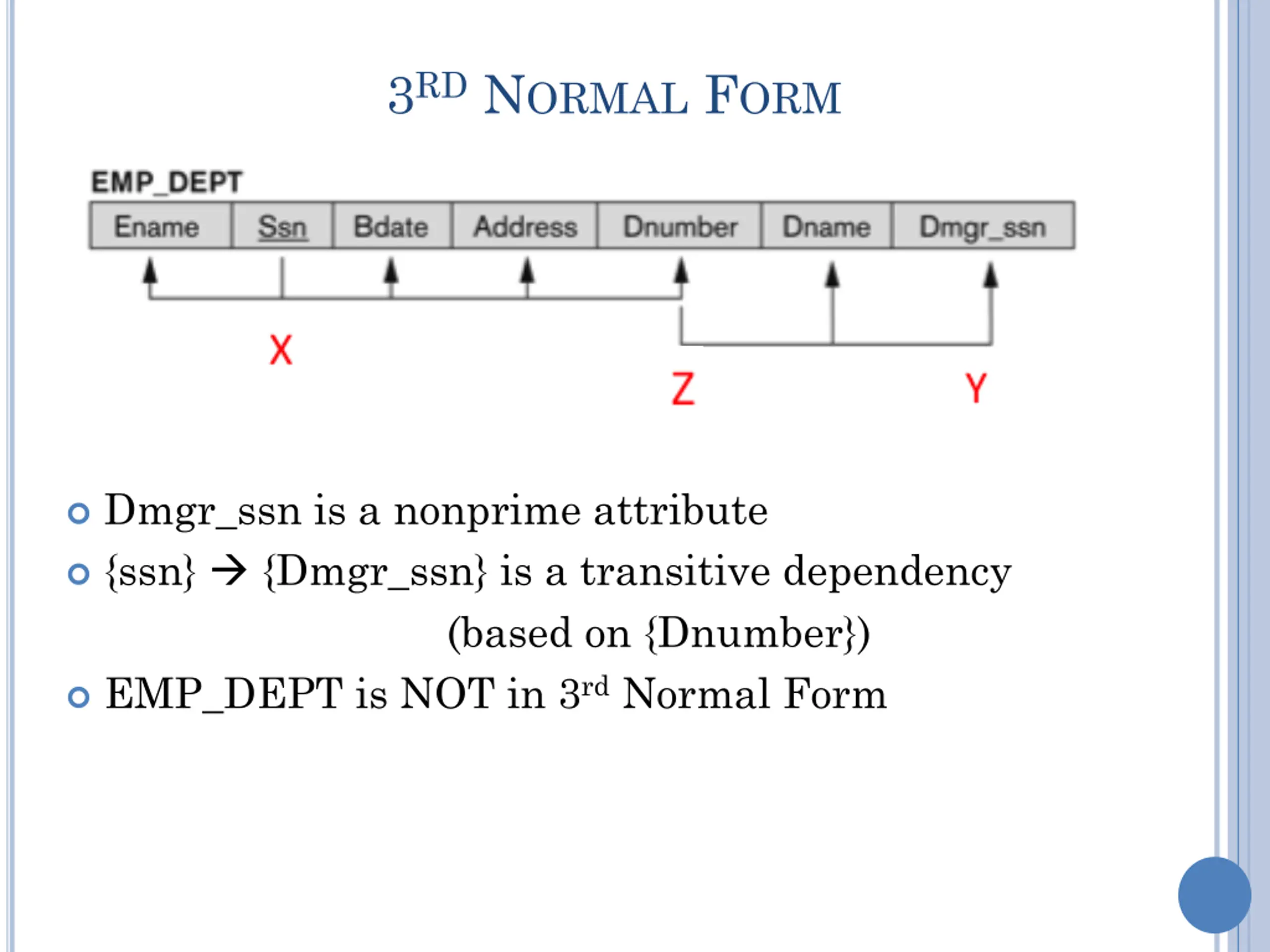 3RD NORMAL FORM Dmgr_ssn is a nonprime attribute {ssn} {Dmgr_ssn} is a transitive dependency (based on {Dnumber}) EMP_DEPT is NOT in 3rd Normal Form