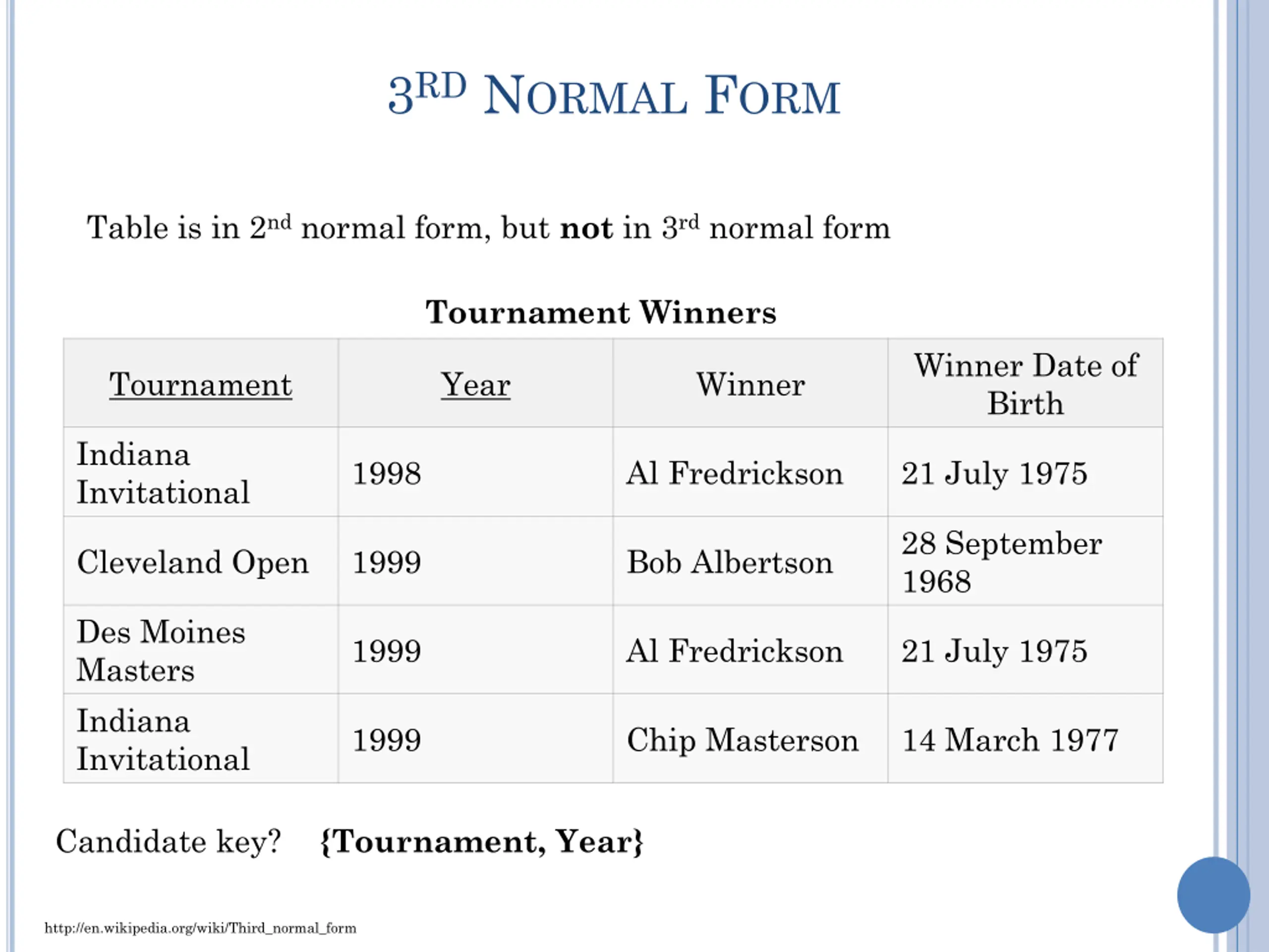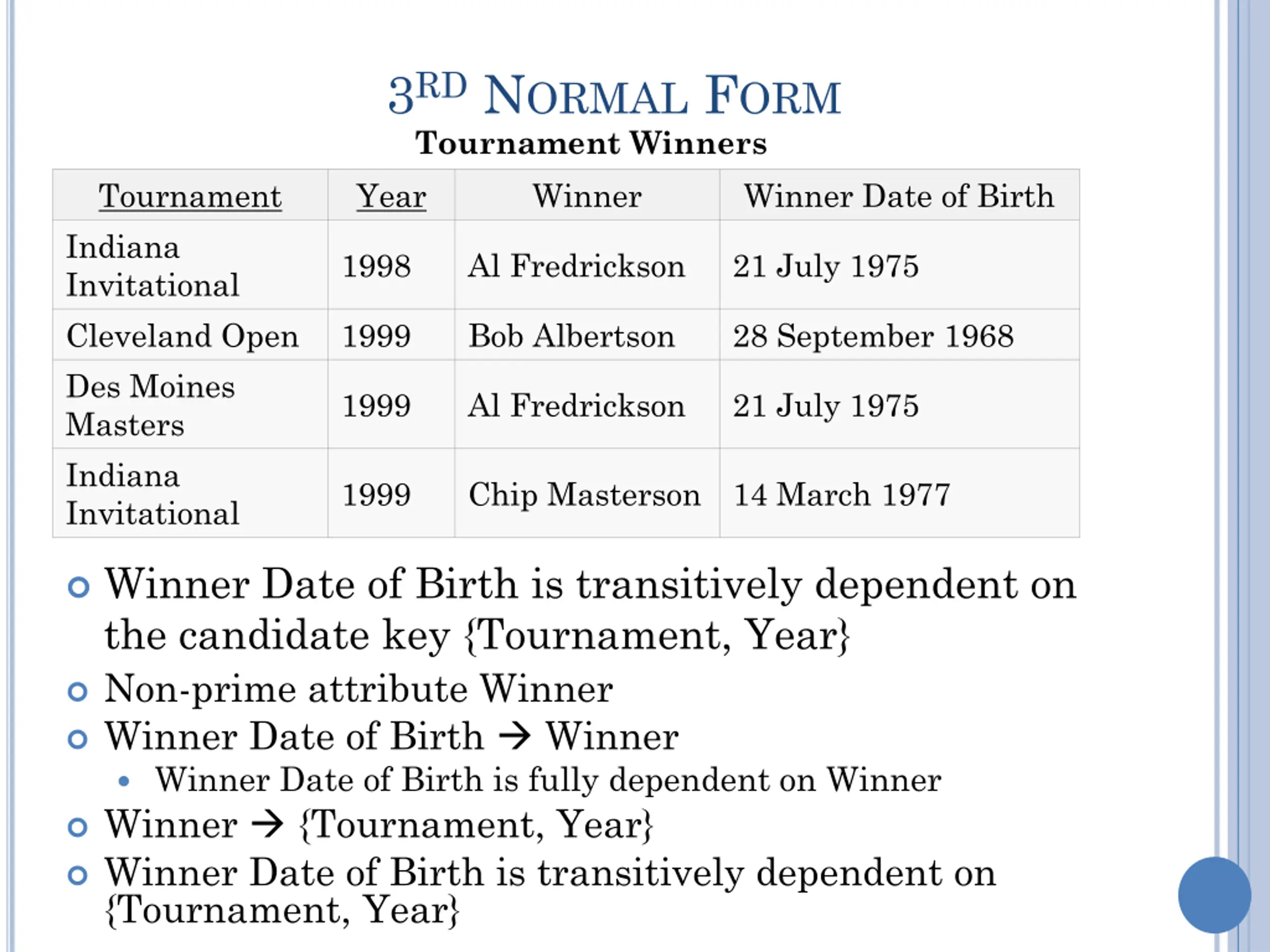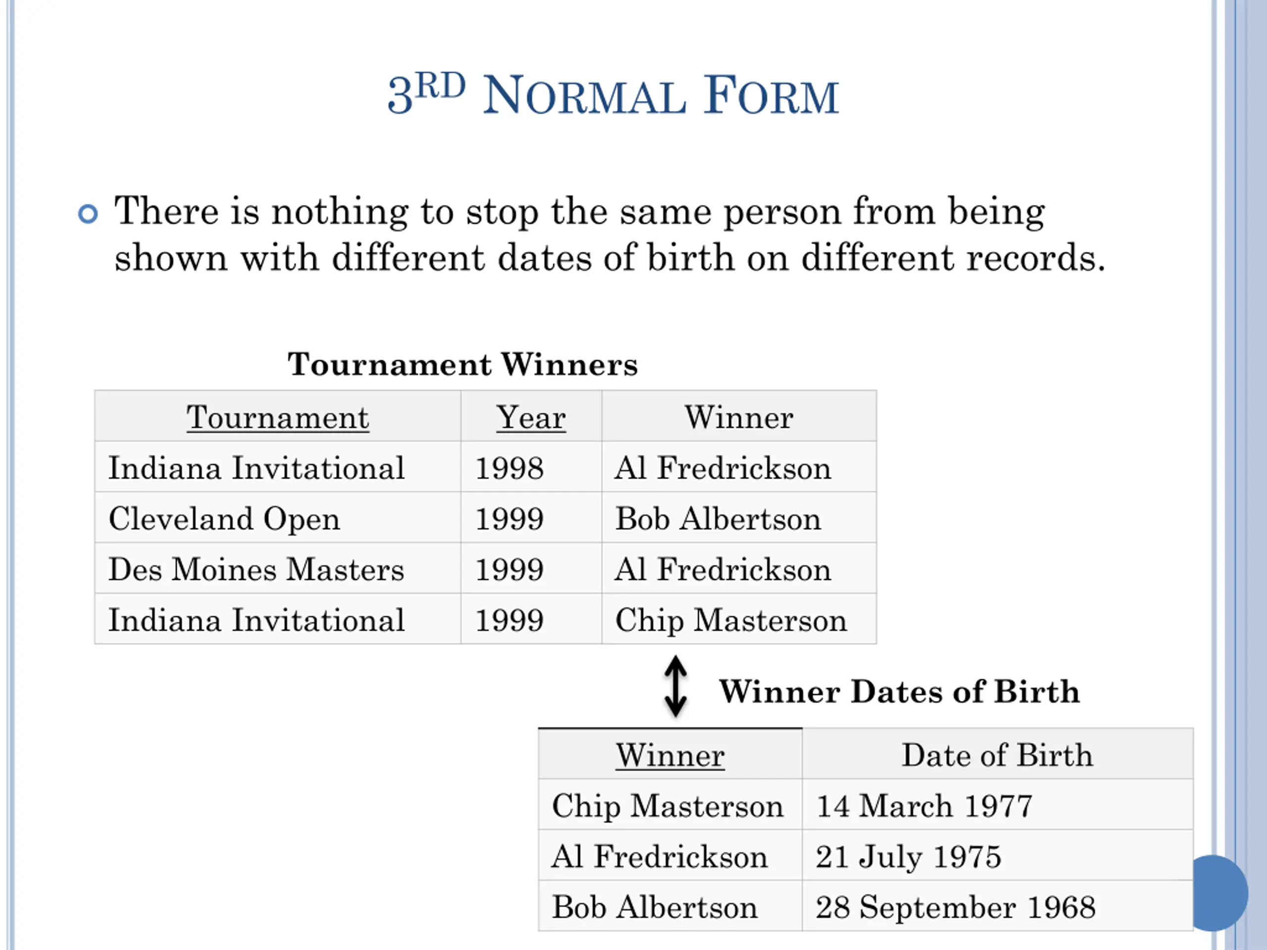 3RD NORMAL FORM There is nothing to stop the same person from being shown with different dates of birth on different records. Tournament Winners Tournament Indiana Invitational Cleveland Open Des Moines Masters Indiana Invitational Year 1998 1999 1999 1999 Winner Al Fredrickson Bob Albertson Al Fredrickson Chip Masterson Winner Dates of Birth Winner Date of Birth 14 March 1977 21 July 1975 28 September 1968 Chip Masterson Al Fredrickson Bob Albertson