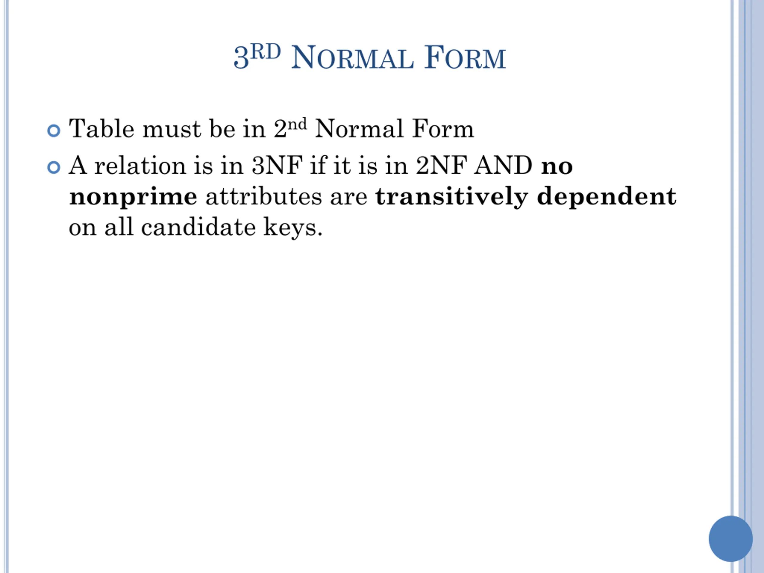 3RD NORMAL FORM Table must be in 2nd Normal Form A relation is in 3NF if it is in 2NF AND no nonprime attributes are transitively dependent on all candidate keys.