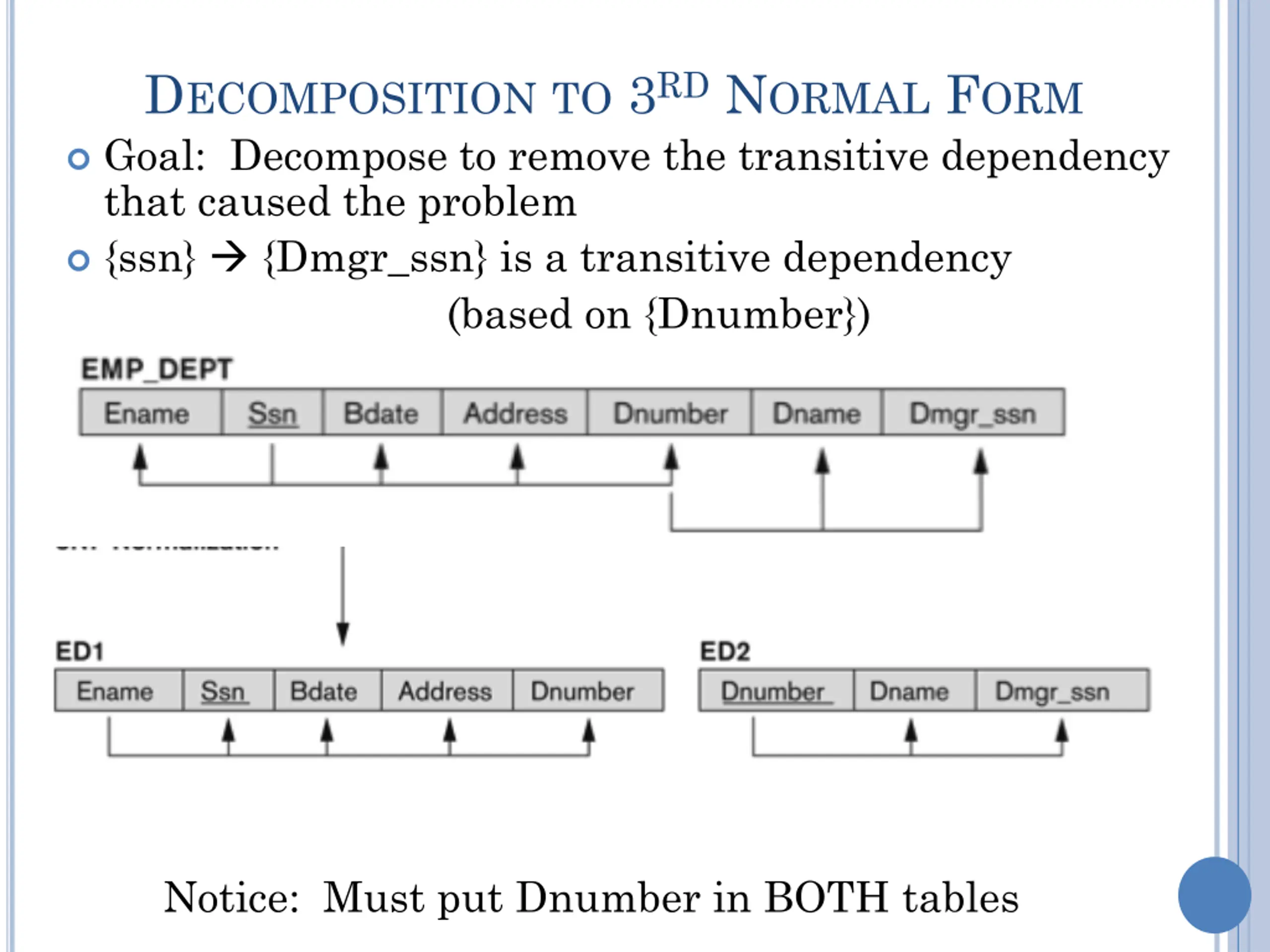 DECOMPOSITIONTO 3RD NORMAL FORM Goal: Decompose to remove the transitive dependency that caused the problem {ssn} {Dmgr_ssn} is a transitive dependency (based on {Dnumber}) Notice: Must put Dnumber in BOTH tables