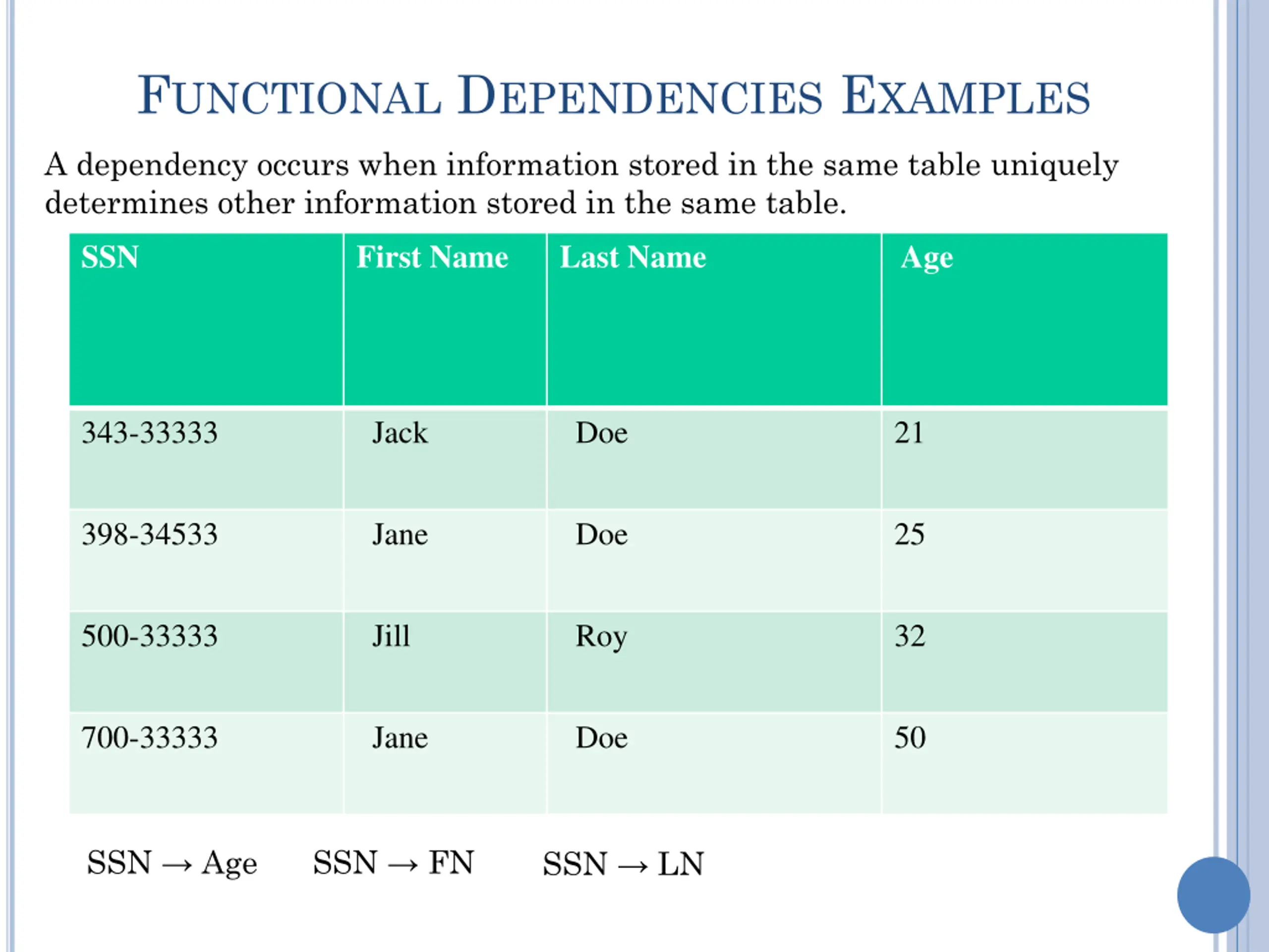 FUNCTIONAL DEPENDENCIES EXAMPLES A dependency occurs when information stored in the same table uniquely determines other information stored in the same table. SSN First Name Last Name Age 343-33333 Jack Doe 21 398-34533 Jane Doe 25 500-33333 Jill Roy 32 700-33333 Jane Doe 50 SSN Age SSN FN SSN LN
