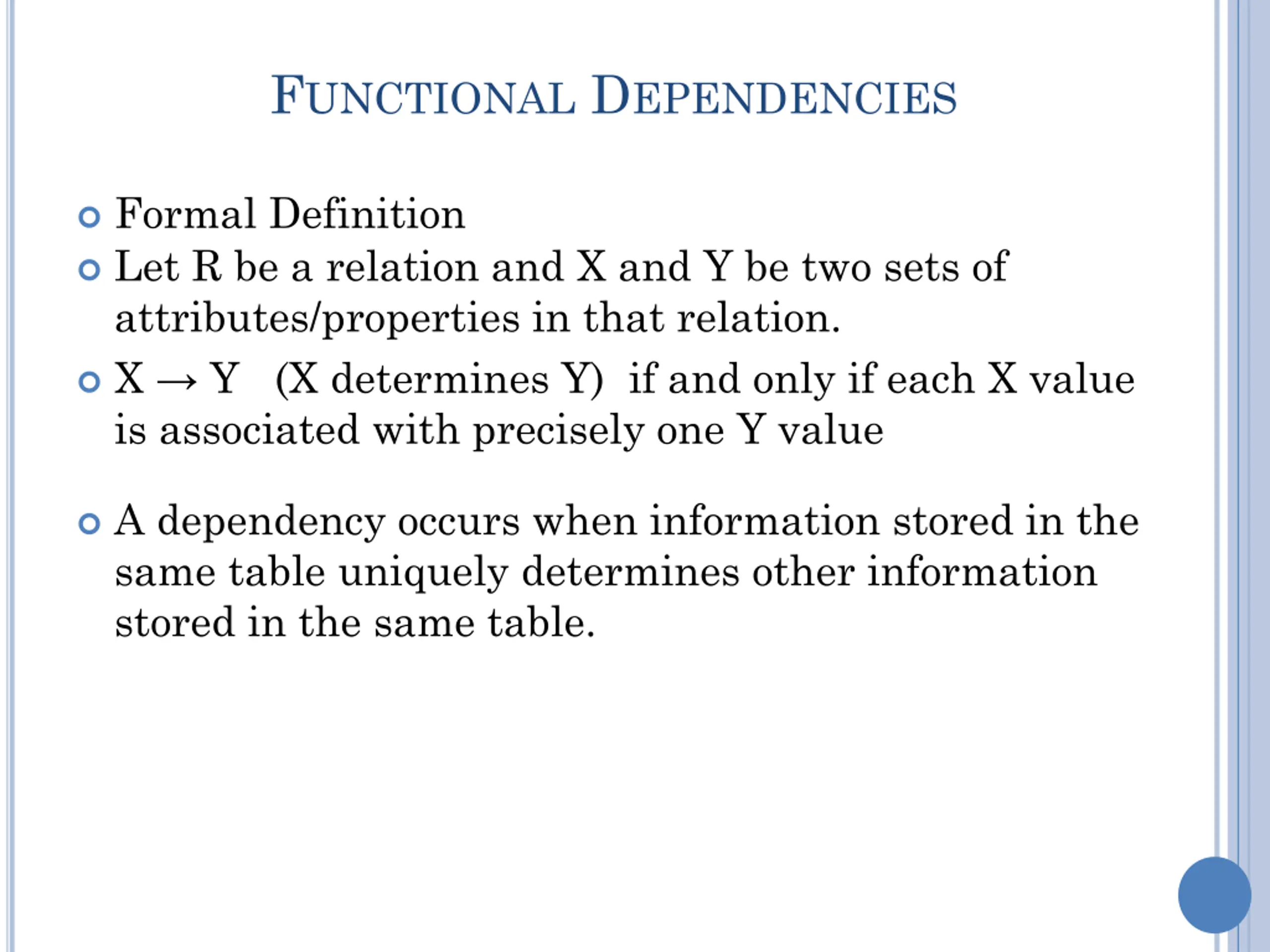 FUNCTIONAL DEPENDENCIES Formal Definition Let R be a relation and X and Y be two sets of attributes/properties in that relation. X Y (X determines Y) if and only if each X value is associated with precisely one Y value A dependency occurs when information stored in the same table uniquely determines other information stored in the same table.