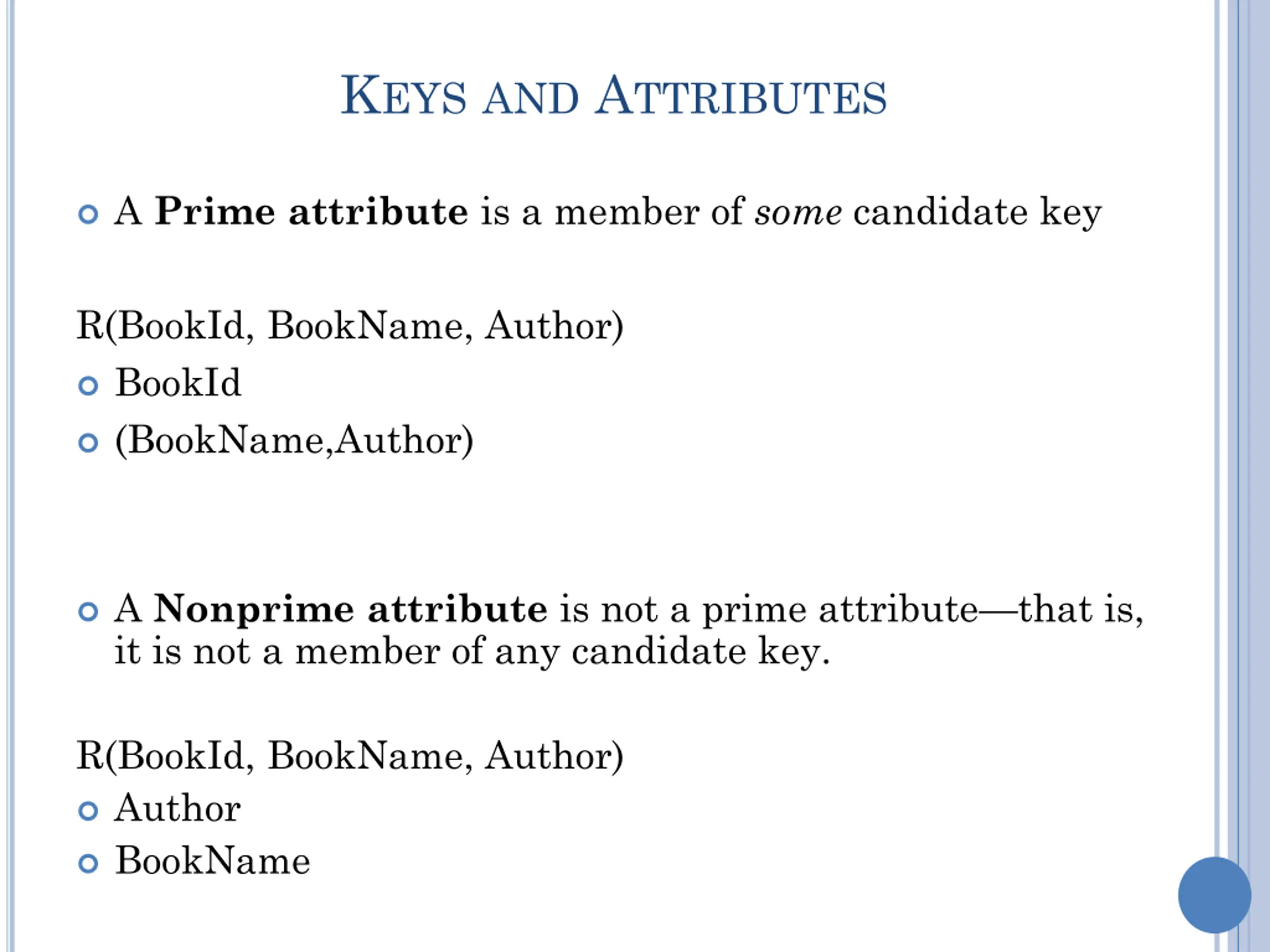 KEYSAND ATTRIBUTES A Prime attribute is a member of some candidate key R(BookId, BookName, Author) BookId (BookName,Author) A Nonprime attribute is not a prime attribute that is, it is not a member of any candidate key. R(BookId, BookName, Author) Author BookName
