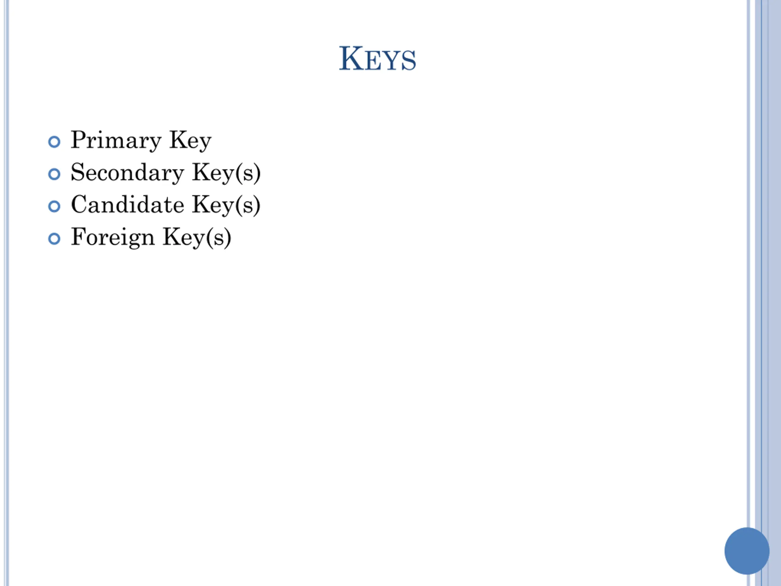 KEYS Primary Key Secondary Key(s) Candidate Key(s) Foreign Key(s)