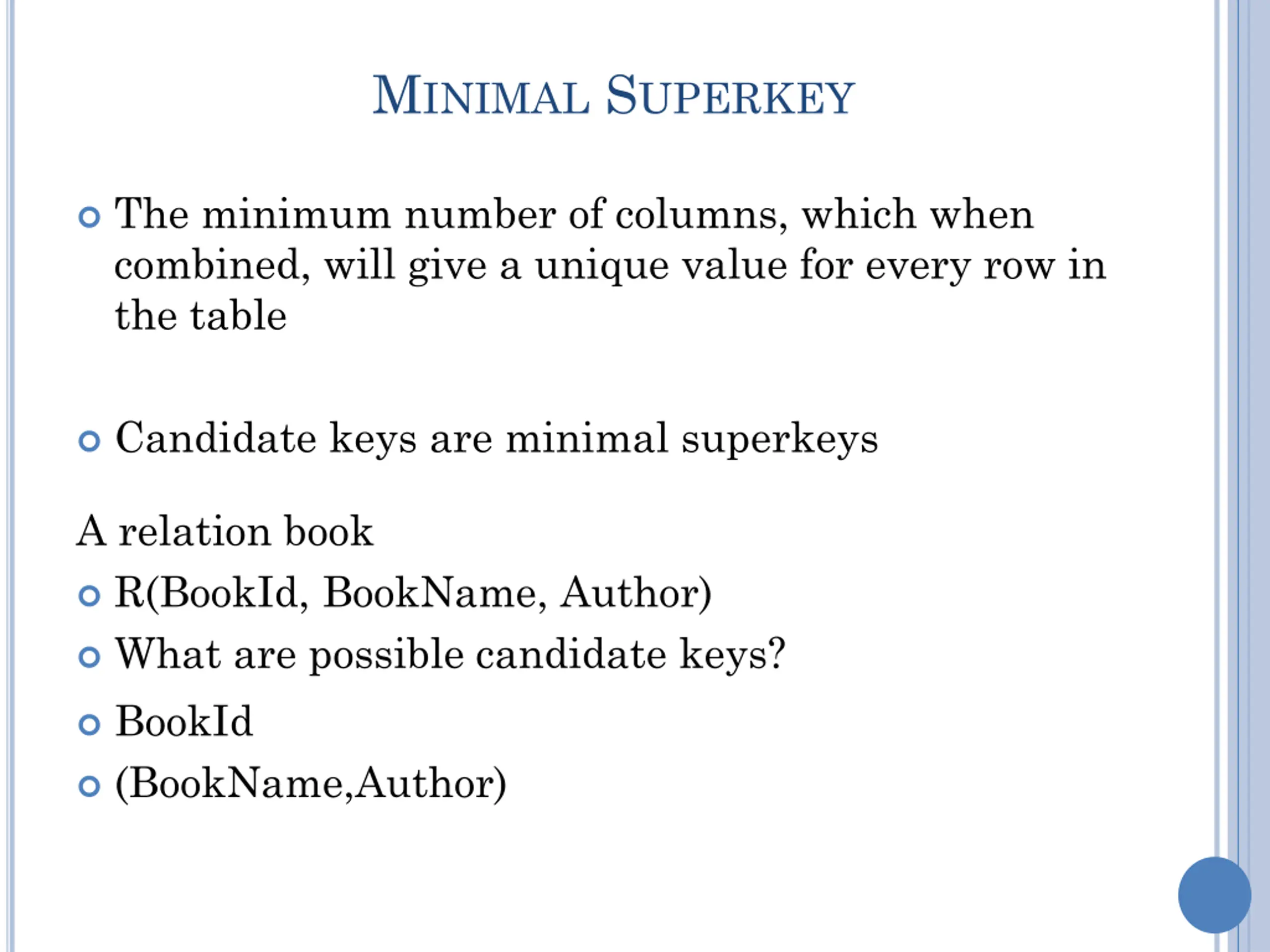 MINIMAL SUPERKEY The minimum number of columns, which when combined, will give a unique value for every row in the table Candidate keys are minimal superkeys A relation book R(BookId, BookName, Author) What are possible candidate keys? BookId (BookName,Author)