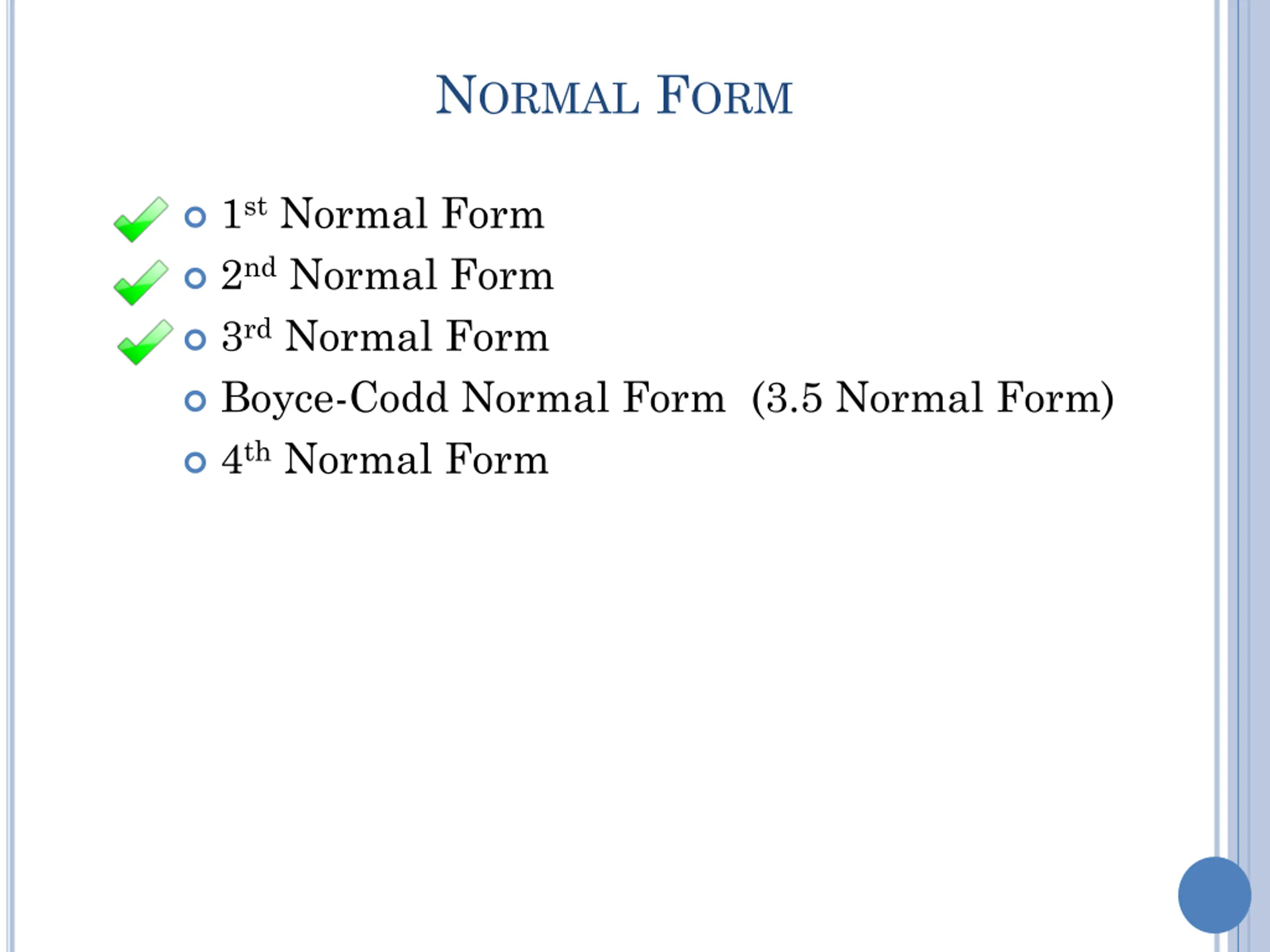 NORMAL FORM 1st Normal Form 2nd Normal Form 3rd Normal Form Boyce-Codd Normal Form (3.5 Normal Form) 4th Normal Form