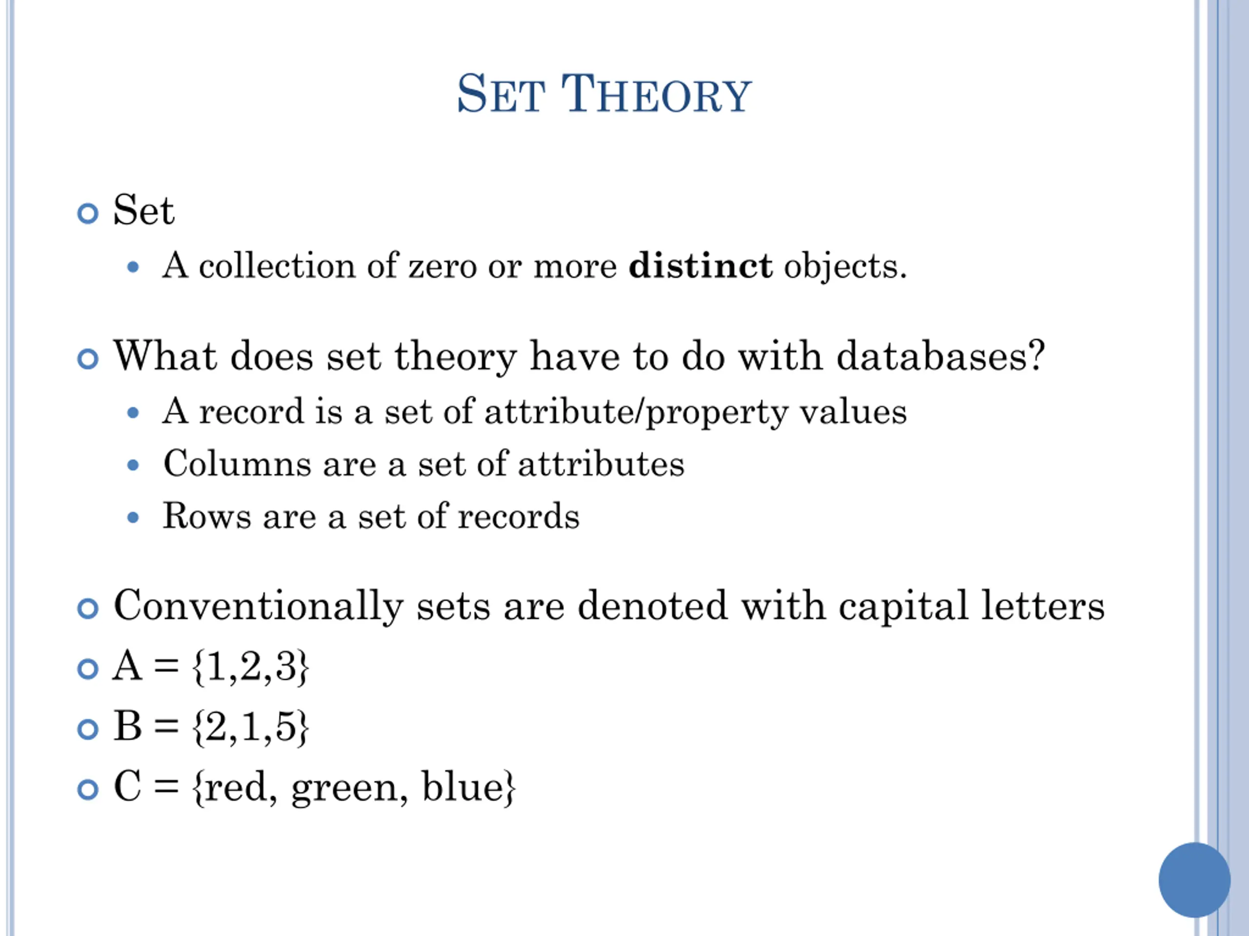 SET THEORY Set A collection of zero or more distinct objects. What does set theory have to do with databases? A record is a set of attribute/property values Columns are a set of attributes Rows are a set of records Conventionally sets are denoted with capital letters A = {1,2,3} B = {2,1,5} C = {red, green, blue}