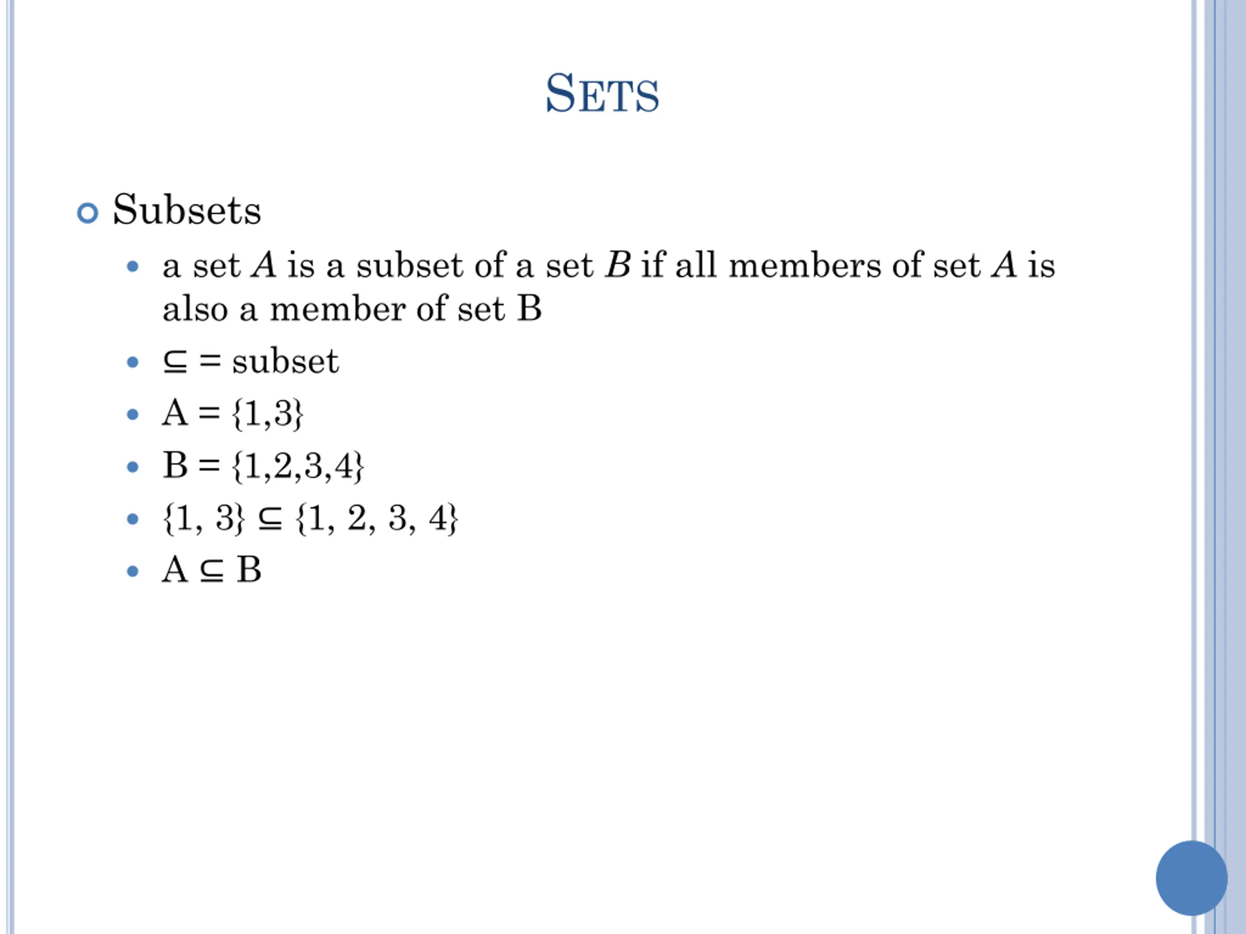 SETS Subsets a set A is a subset of a set B if all members of set A is also a member of set B = subset A = {1,3} B = {1,2,3,4} {1, 3} {1, 2, 3, 4} A B