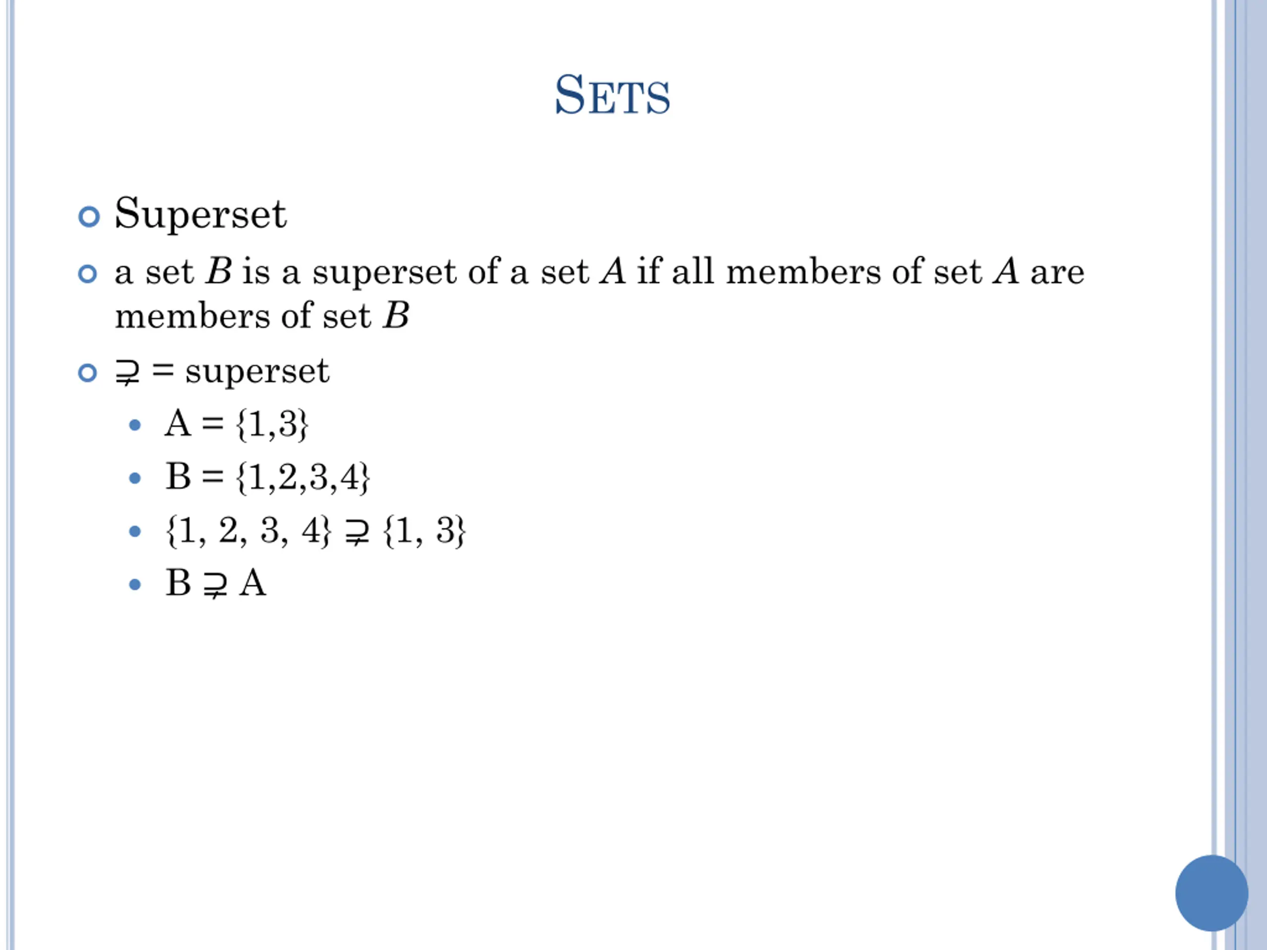 SETS Superset a set B is a superset of a set A if all members of set A are members of set B = superset A = {1,3} B = {1,2,3,4} {1, 2, 3, 4} {1, 3} B A