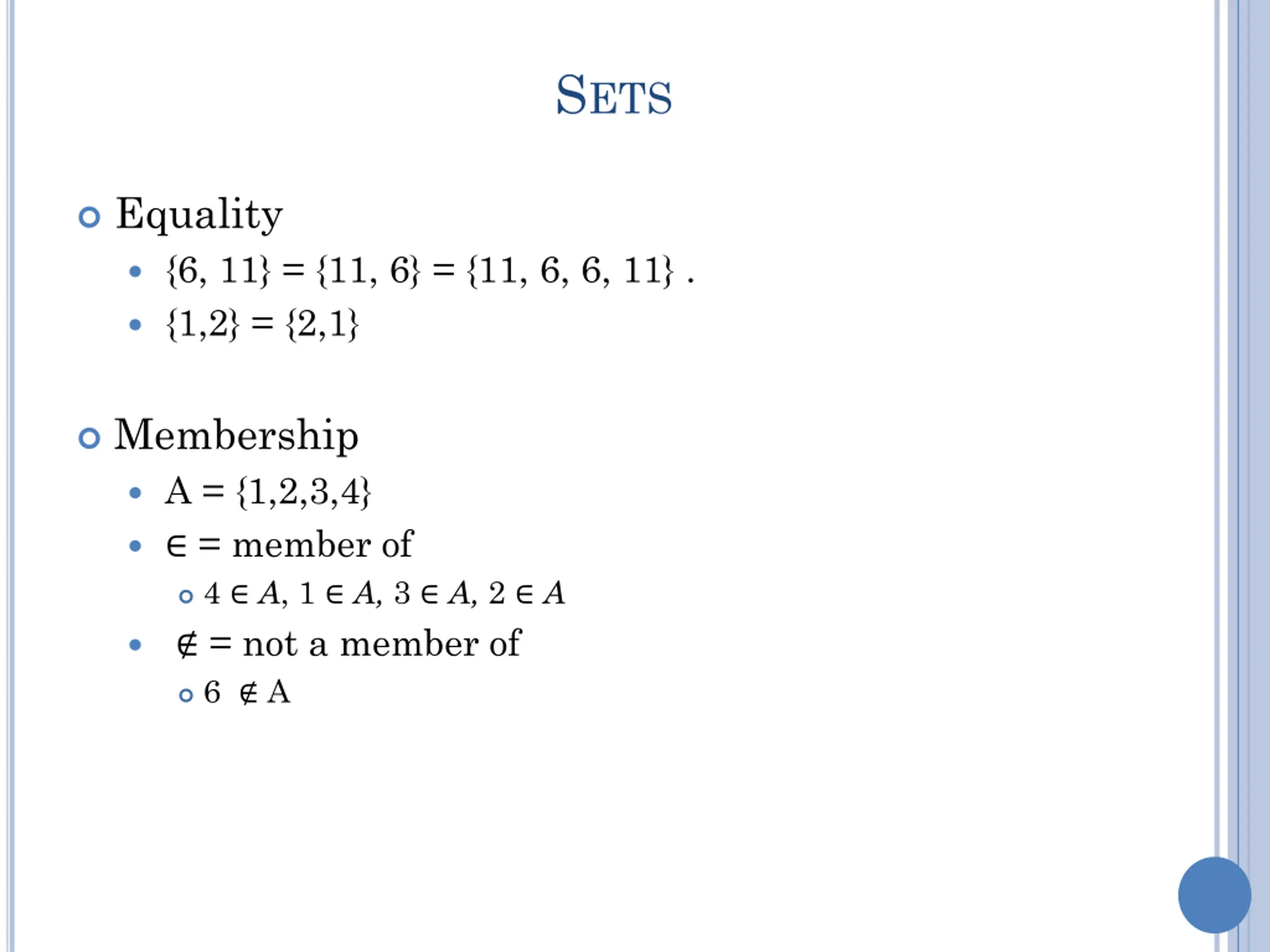 SETS Equality {6, 11} = {11, 6} = {11, 6, 6, 11} . {1,2} = {2,1} Membership A = {1,2,3,4} = member of 4 A, 1 A, 3 A, 2 A = not a member of 6 A