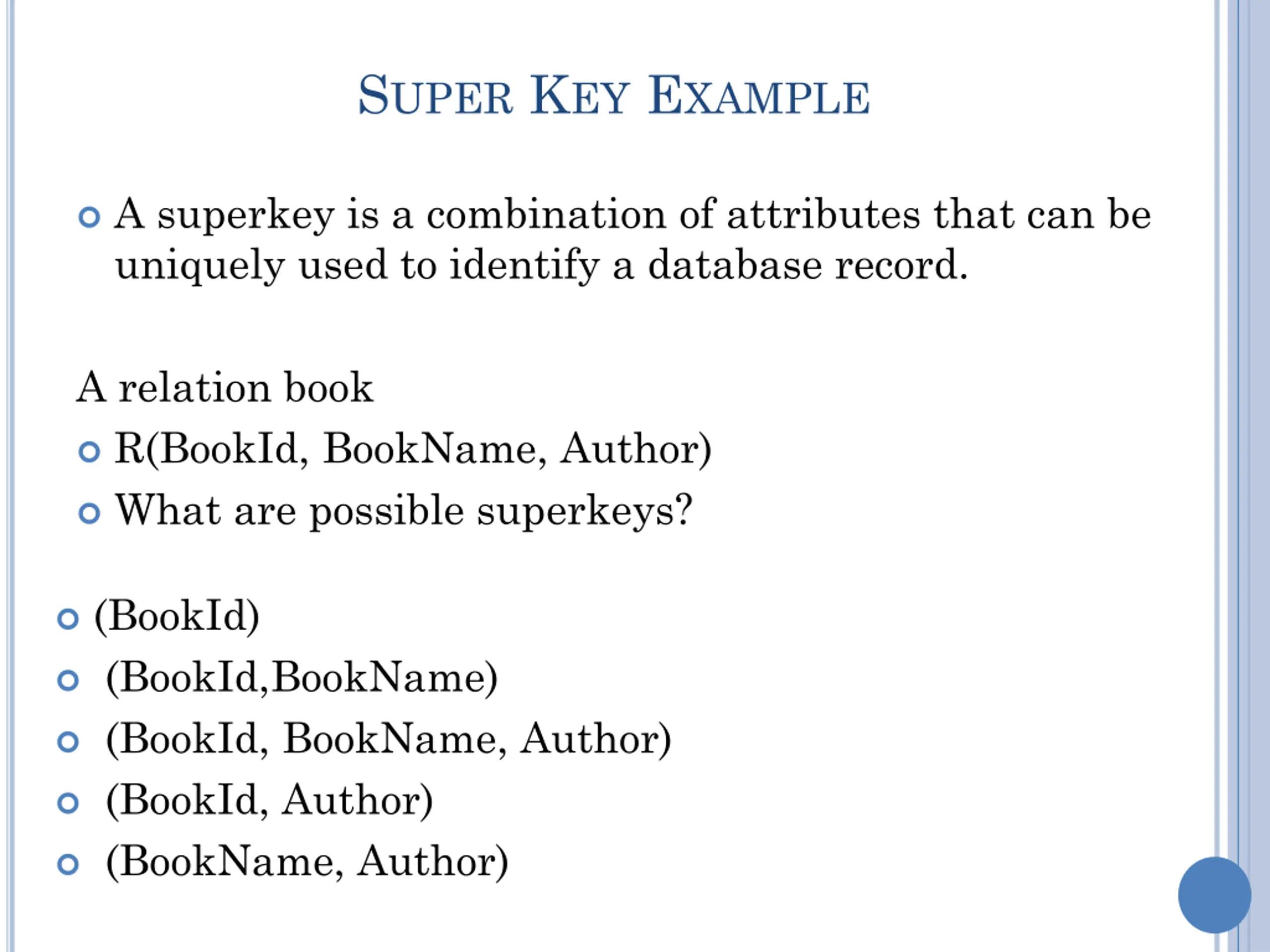 SUPER KEY EXAMPLE A superkey is a combination of attributes that can be uniquely used to identify a database record. A relation book R(BookId, BookName, Author) What are possible superkeys? (BookId) (BookId,BookName) (BookId, BookName, Author) (BookId, Author) (BookName, Author)