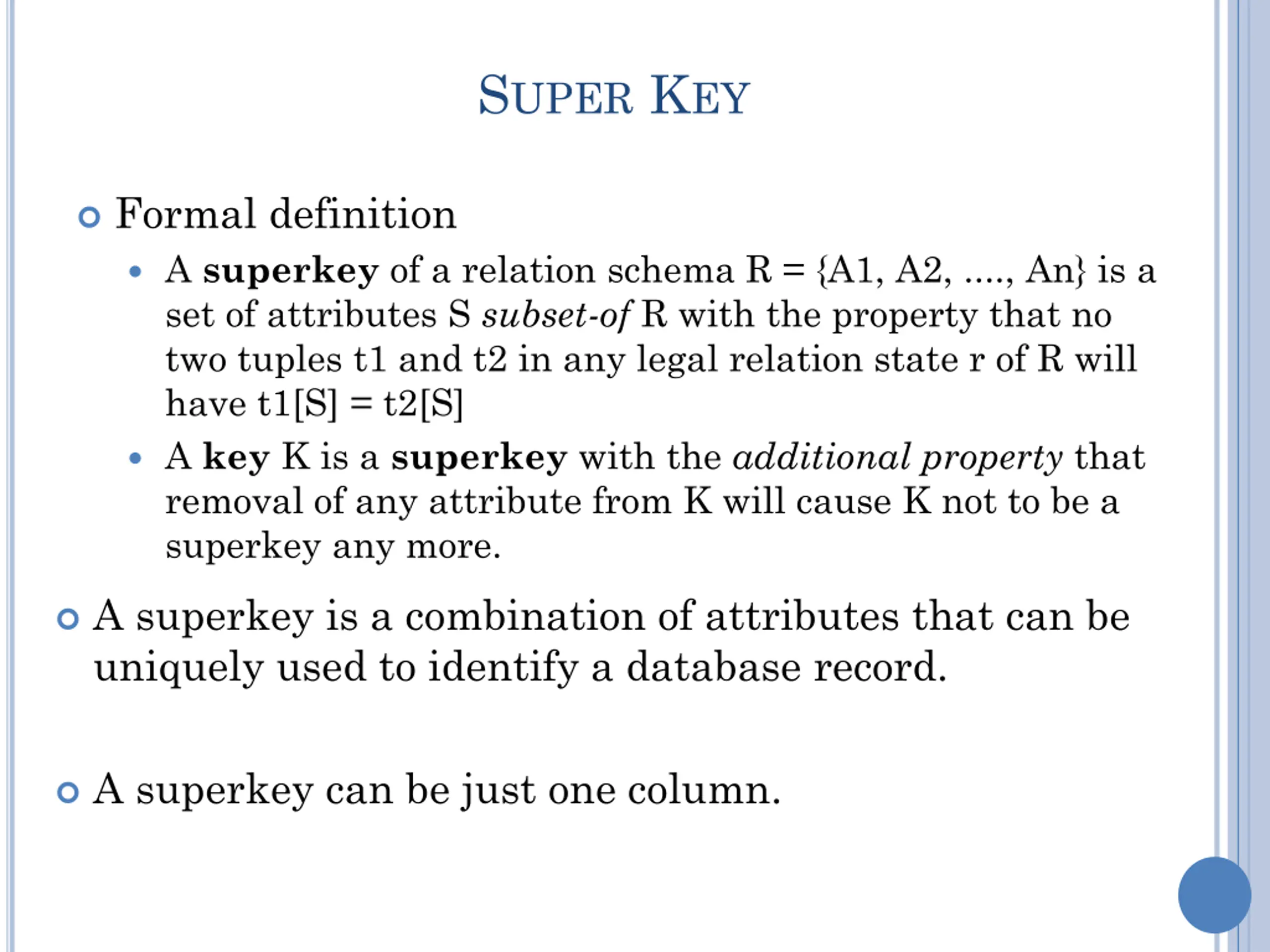 SUPER KEY Formal definition A superkey of a relation schema R = {A1, A2, ...., An} is a set of attributes S subset-of R with the property that no two tuples t1 and t2 in any legal relation state r of R will have t1[S] = t2[S] A key K is a superkey with the additional property that removal of any attribute from K will cause K not to be a superkey any more. A superkey is a combination of attributes that can be uniquely used to identify a database record. A superkey can be just one column.