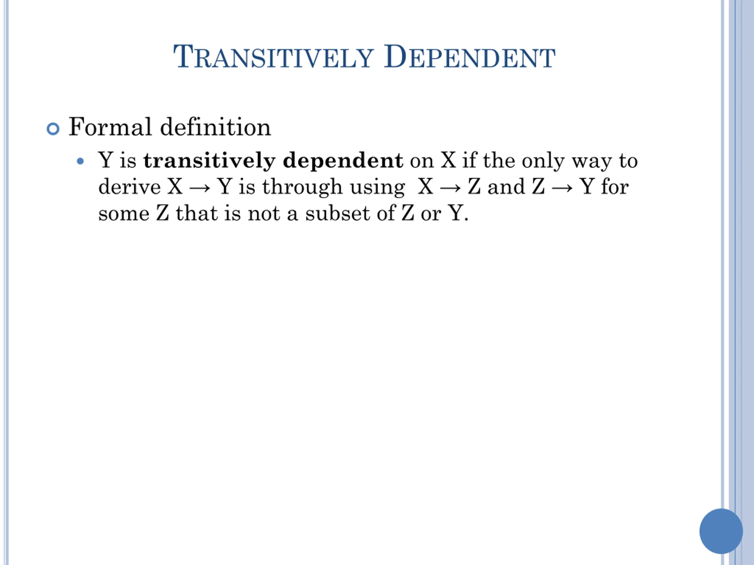TRANSITIVELY DEPENDENT Formal definition Y is transitively dependent on X if the only way to derive X Y is through using X Z and Z Y for some Z that is not a subset of Z or Y.