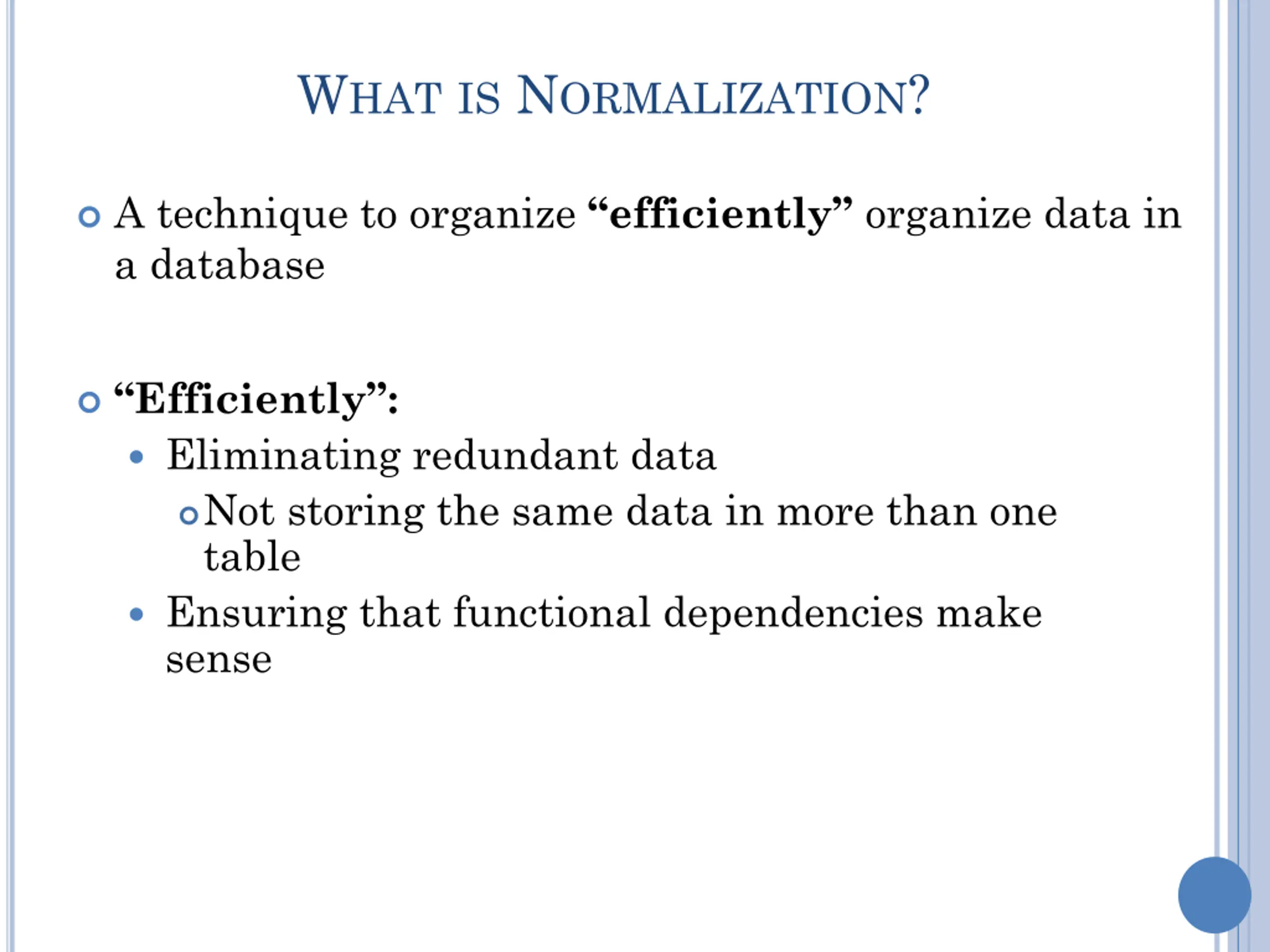 WHATIS NORMALIZATION? A technique to organize efficiently organize data in a database Efficiently : Eliminating redundant data Not storing the same data in more than one table Ensuring that functional dependencies make sense