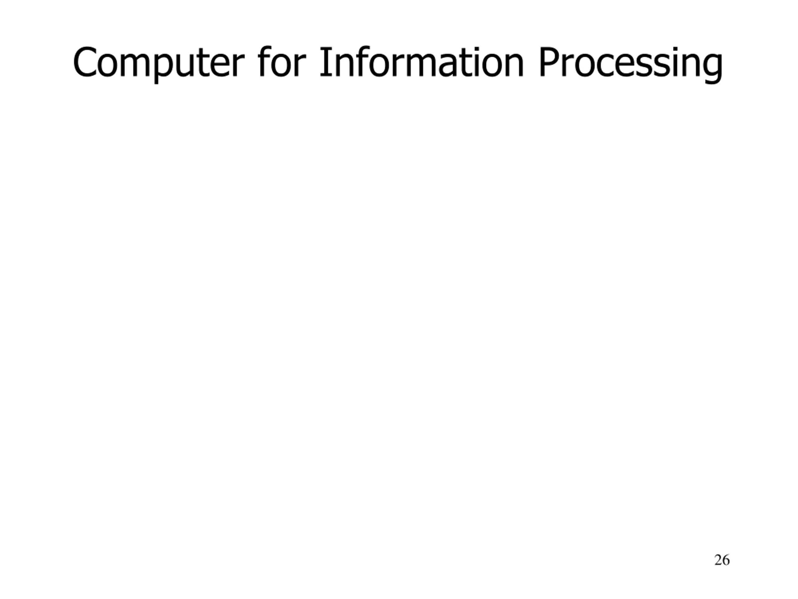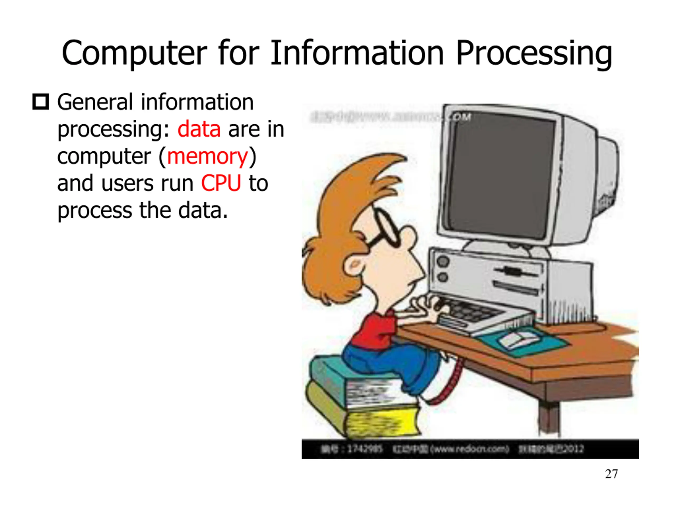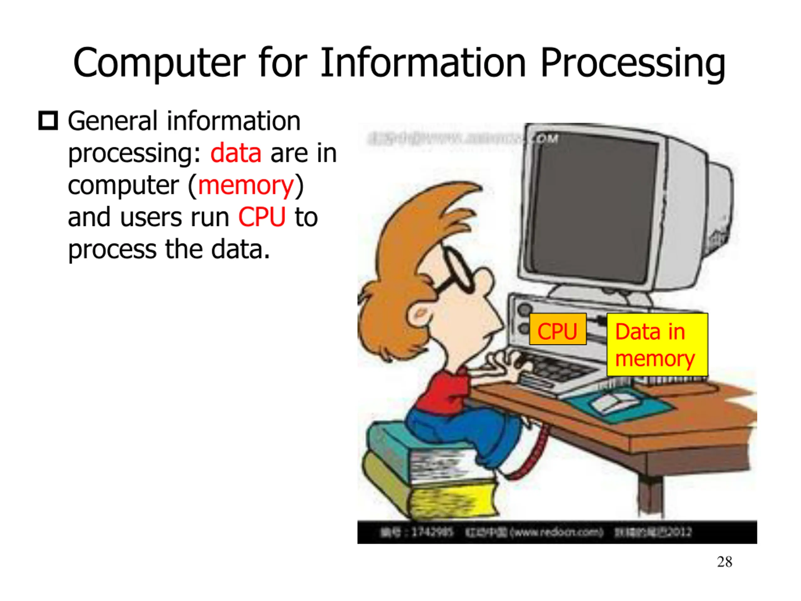 Computer for Information Processing General information processing: data are in computer (memory) and users run CPU to process the data. 27