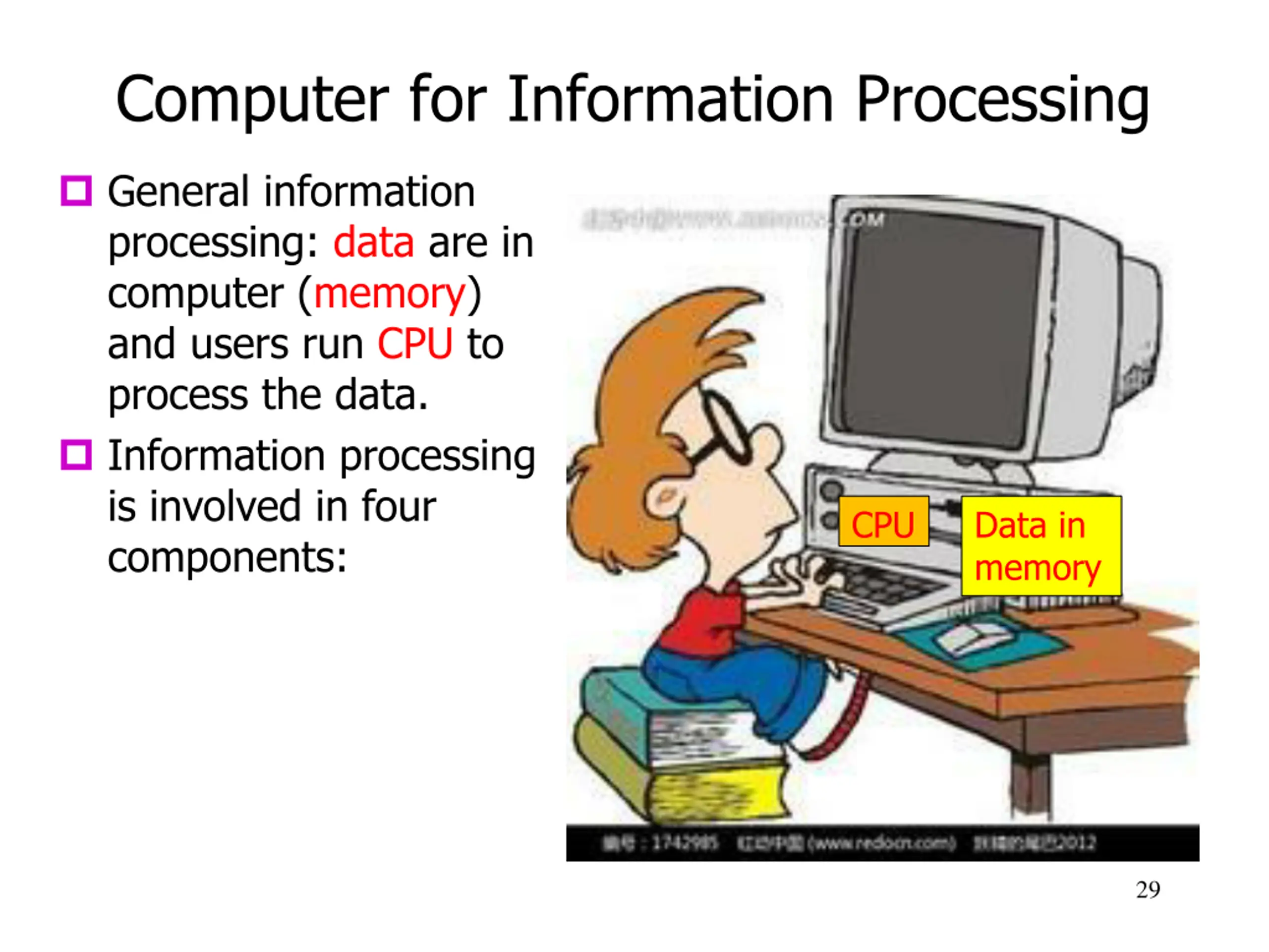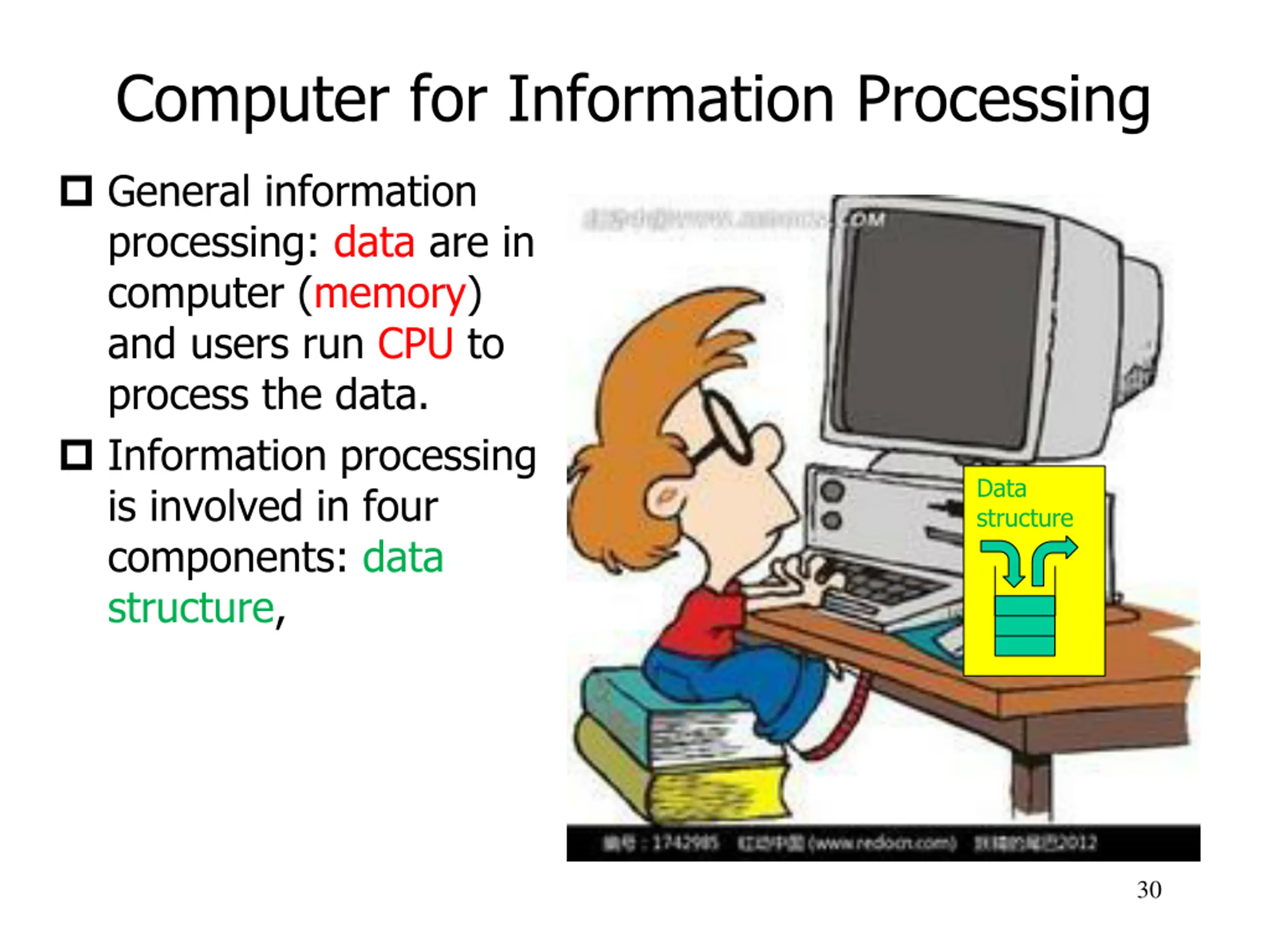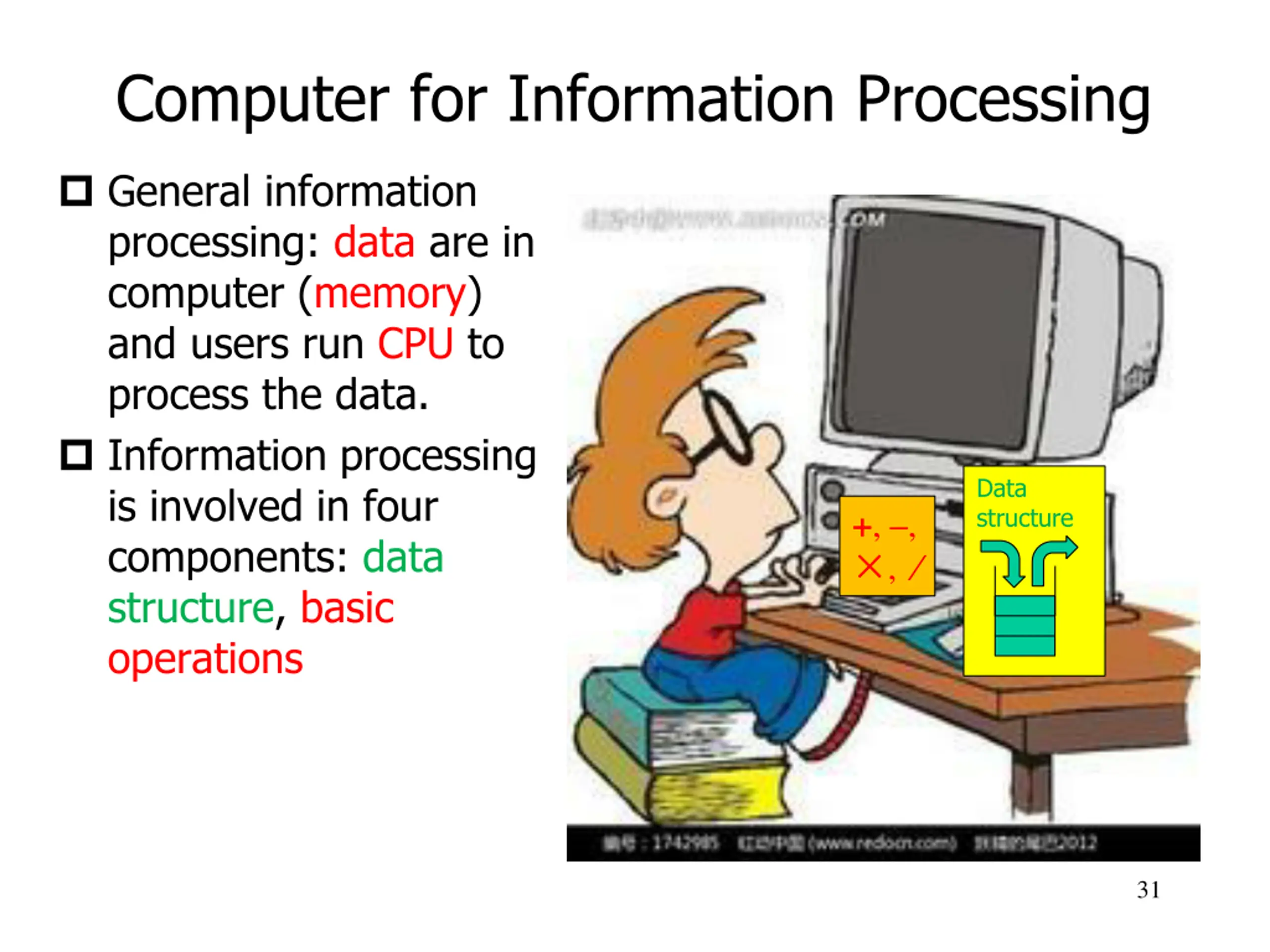 Computer for Information Processing General information processing: data are in computer (memory) and users run CPU to process the data. Information processing is involved in four components: data structure, Data structure 30
