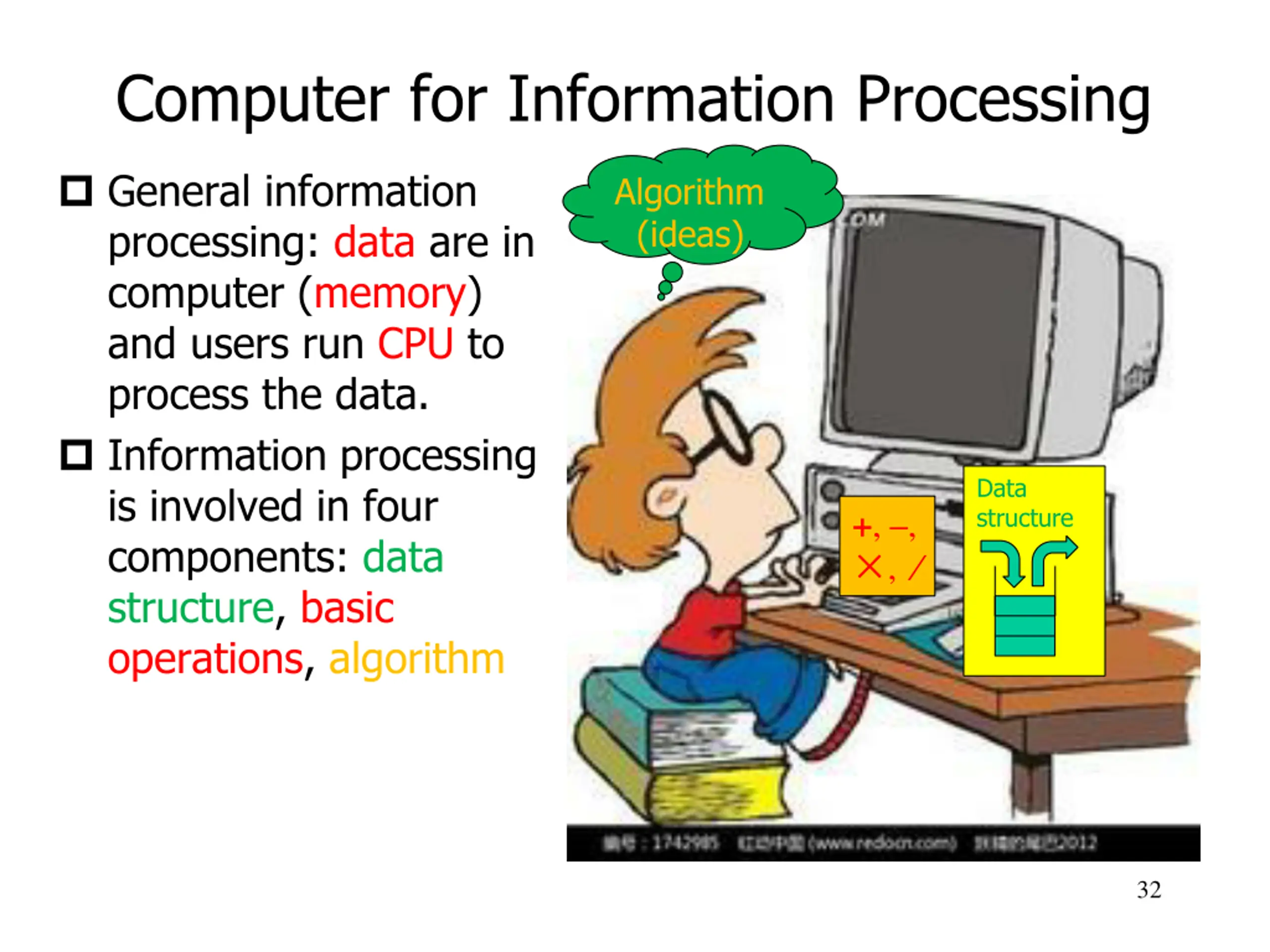 Computer for Information Processing General information processing: data are in computer (memory) and users run CPU to process the data. Information processing is involved in four components: data structure, basic operations, algorithm Algorithm (ideas) Data structure +, , , 32