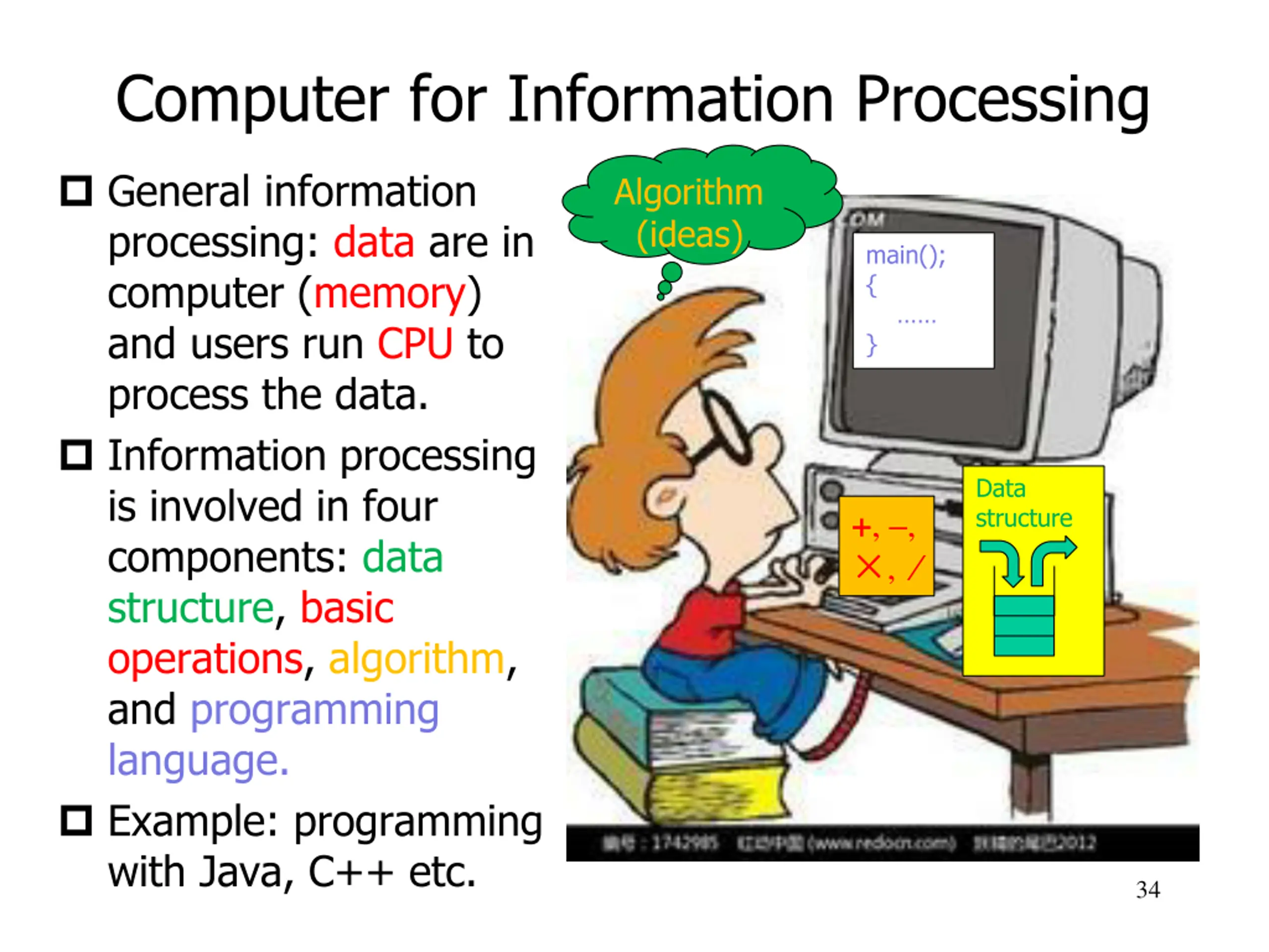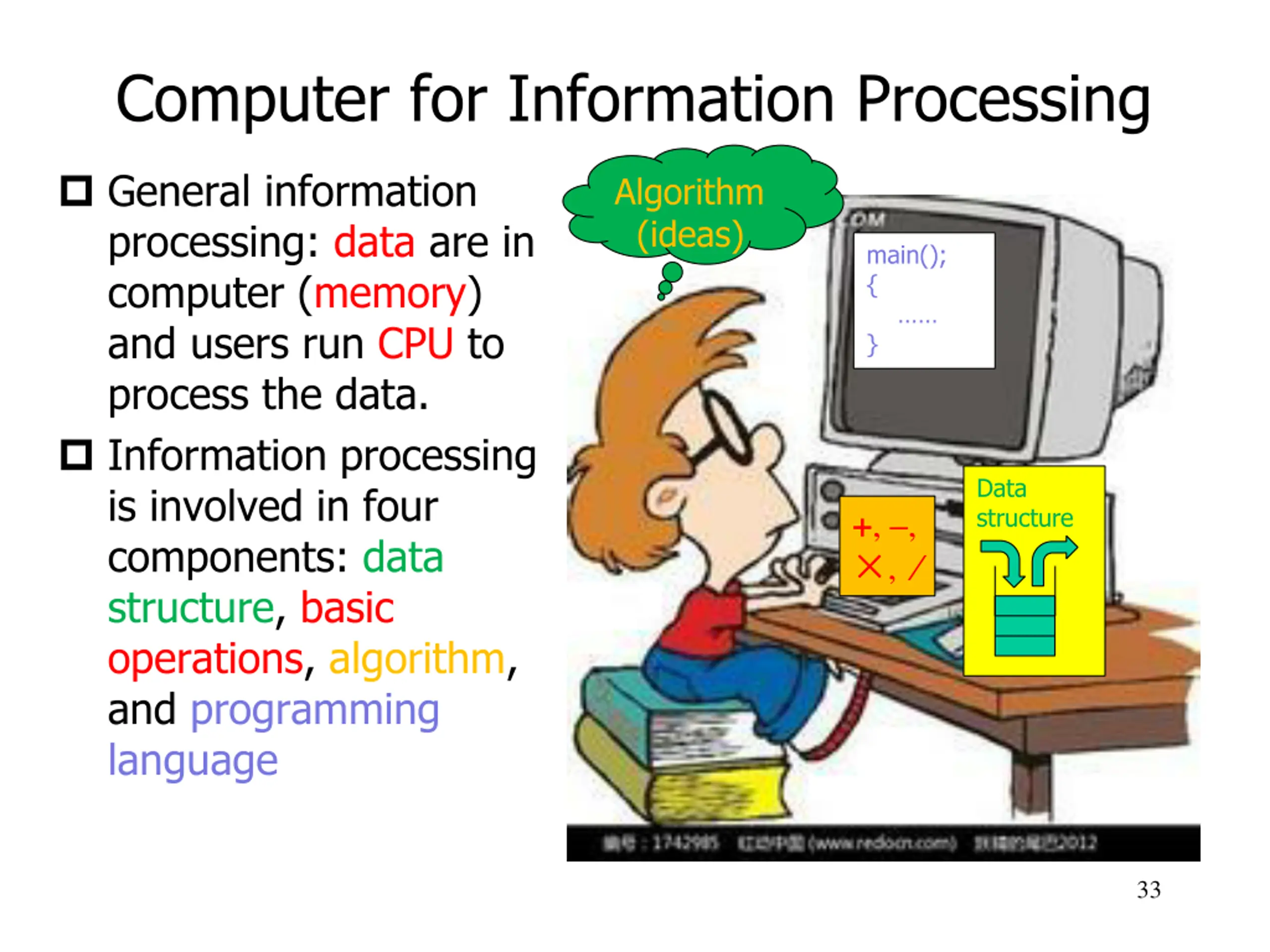 Computer for Information Processing General information processing: data are in computer (memory) and users run CPU to process the data. Information processing is involved in four components: data structure, basic operations, algorithm, and programming language Algorithm (ideas) main(); { } Data structure +, , , 33