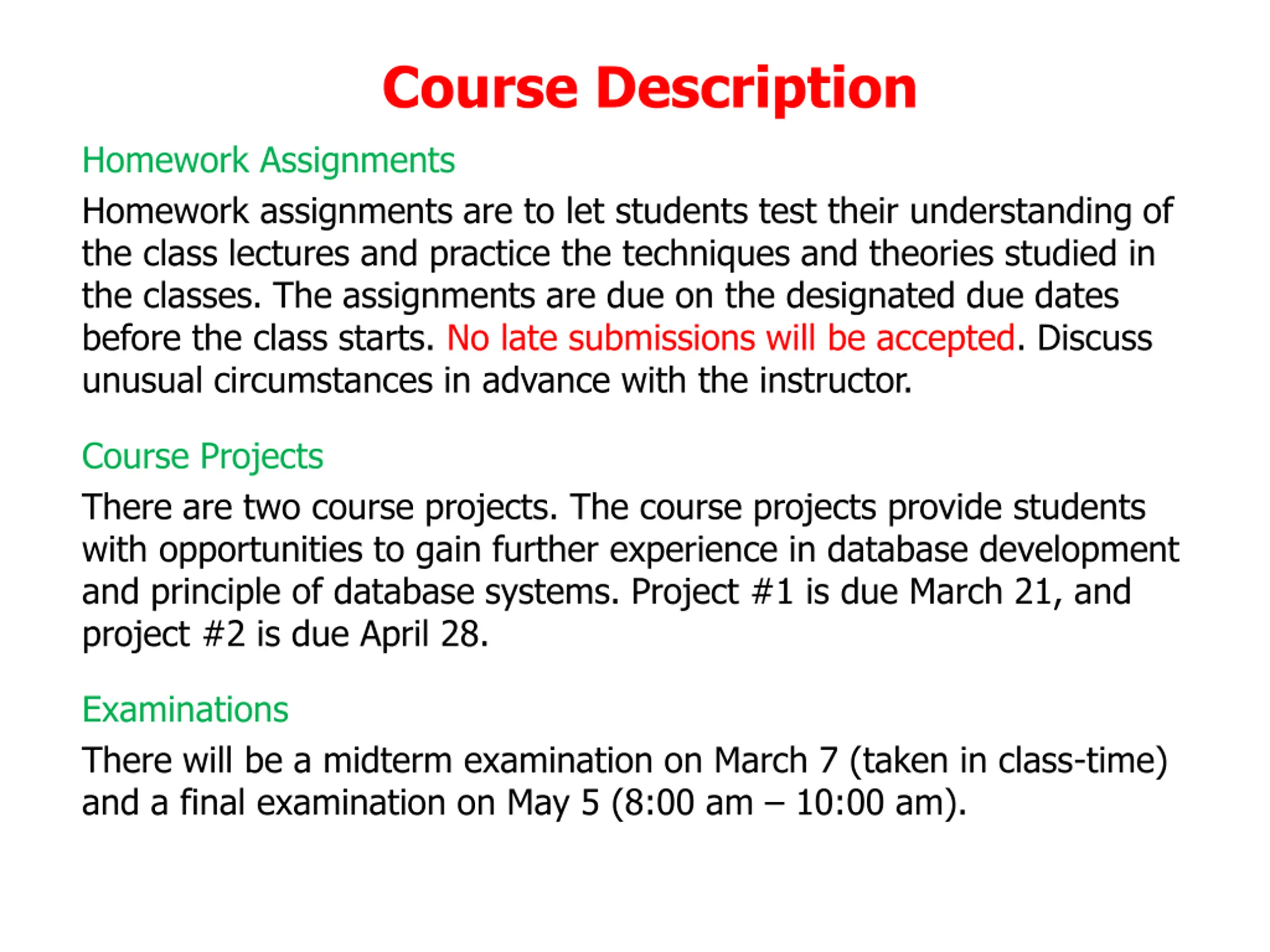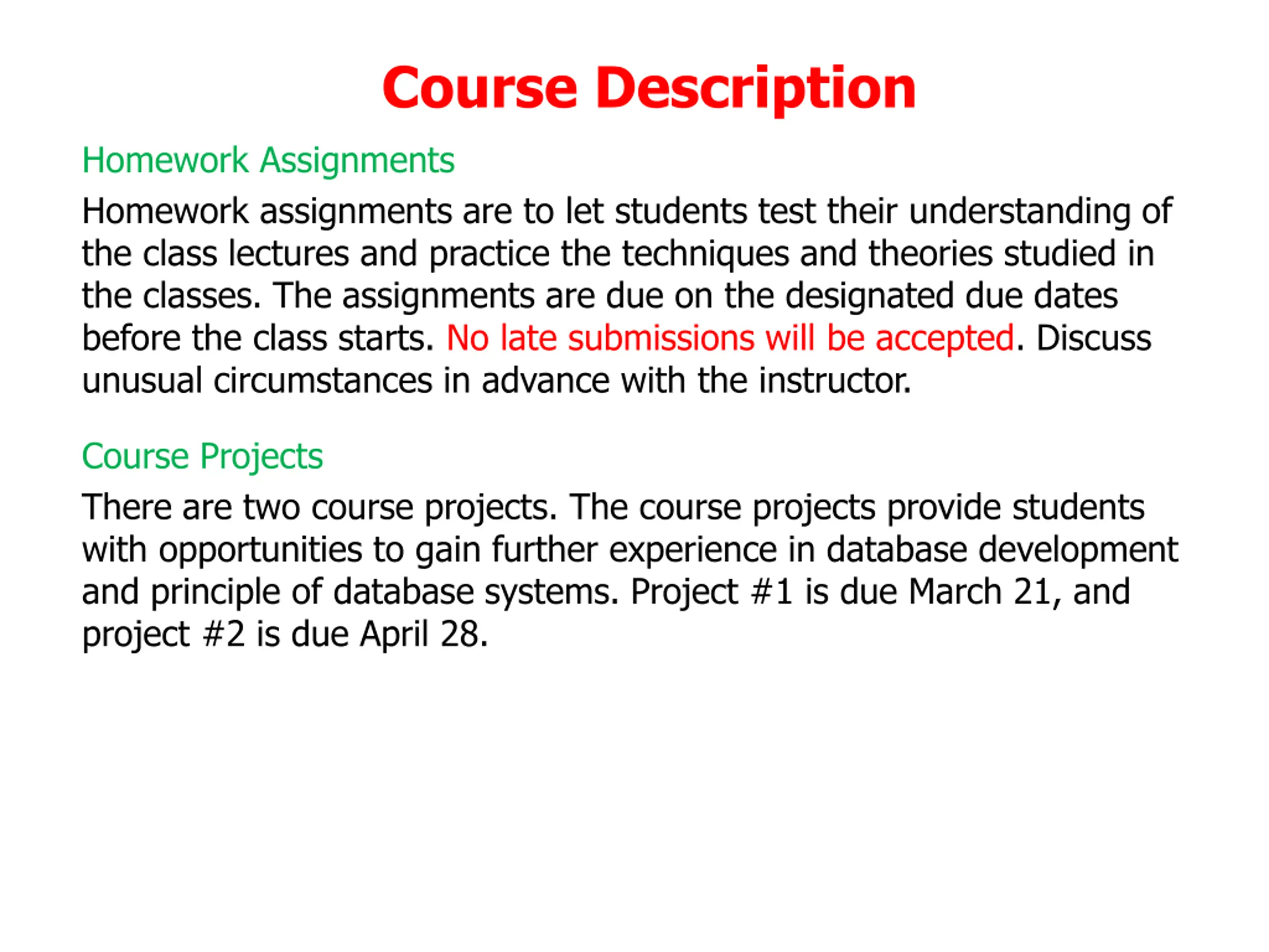 Course Description Homework Assignments Homework assignments are to let students test their understanding of the class lectures and practice the techniques and theories studied in the classes. The assignments are due on the designated due dates before the class starts. No late submissions will be accepted. Discuss unusual circumstances in advance with the instructor. Course Projects There are two course projects. The course projects provide students with opportunities to gain further experience in database development and principle of database systems. Project #1 is due March 21, and project #2 is due April 28.