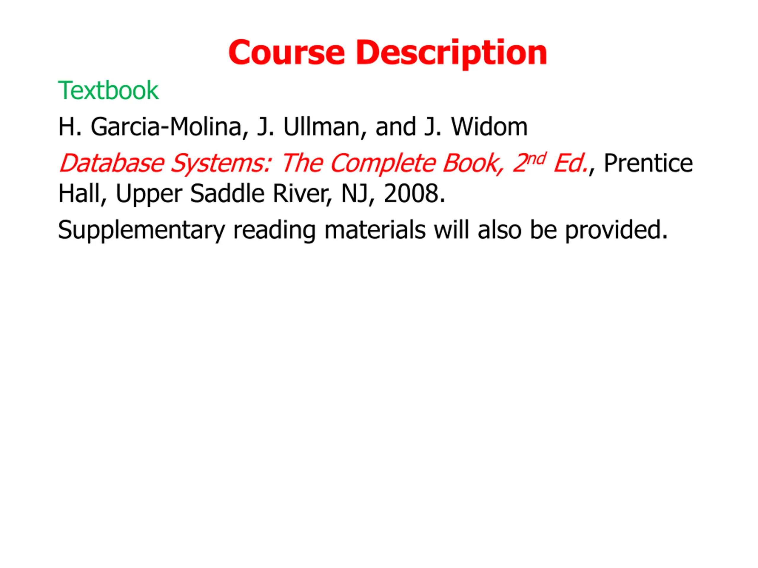 Course Description Textbook H. Garcia-Molina, J. Ullman, and J. Widom Database Systems: The Complete Book, 2nd Ed., Prentice Hall, Upper Saddle River, NJ, 2008. Supplementary reading materials will also be provided.