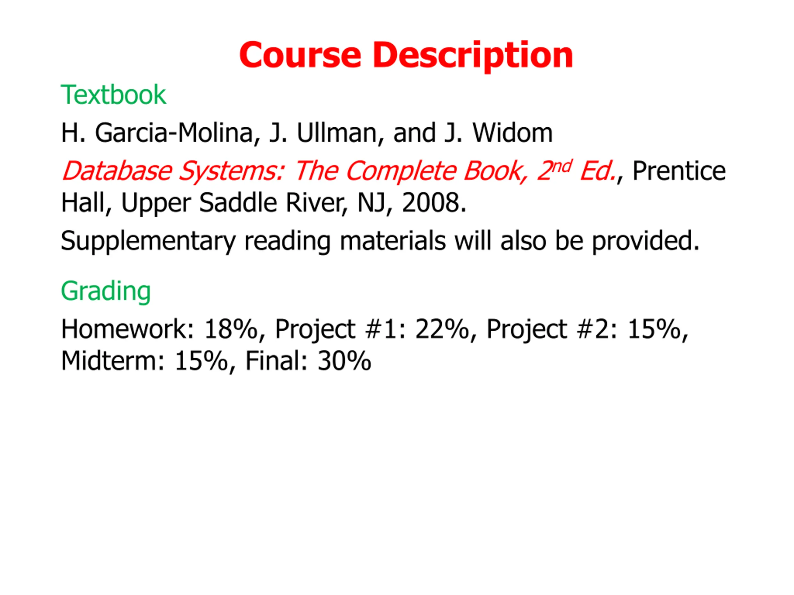 Course Description Textbook H. Garcia-Molina, J. Ullman, and J. Widom Database Systems: The Complete Book, 2nd Ed., Prentice Hall, Upper Saddle River, NJ, 2008. Supplementary reading materials will also be provided. Grading Homework: 18%, Project #1: 22%, Project #2: 15%, Midterm: 15%, Final: 30%