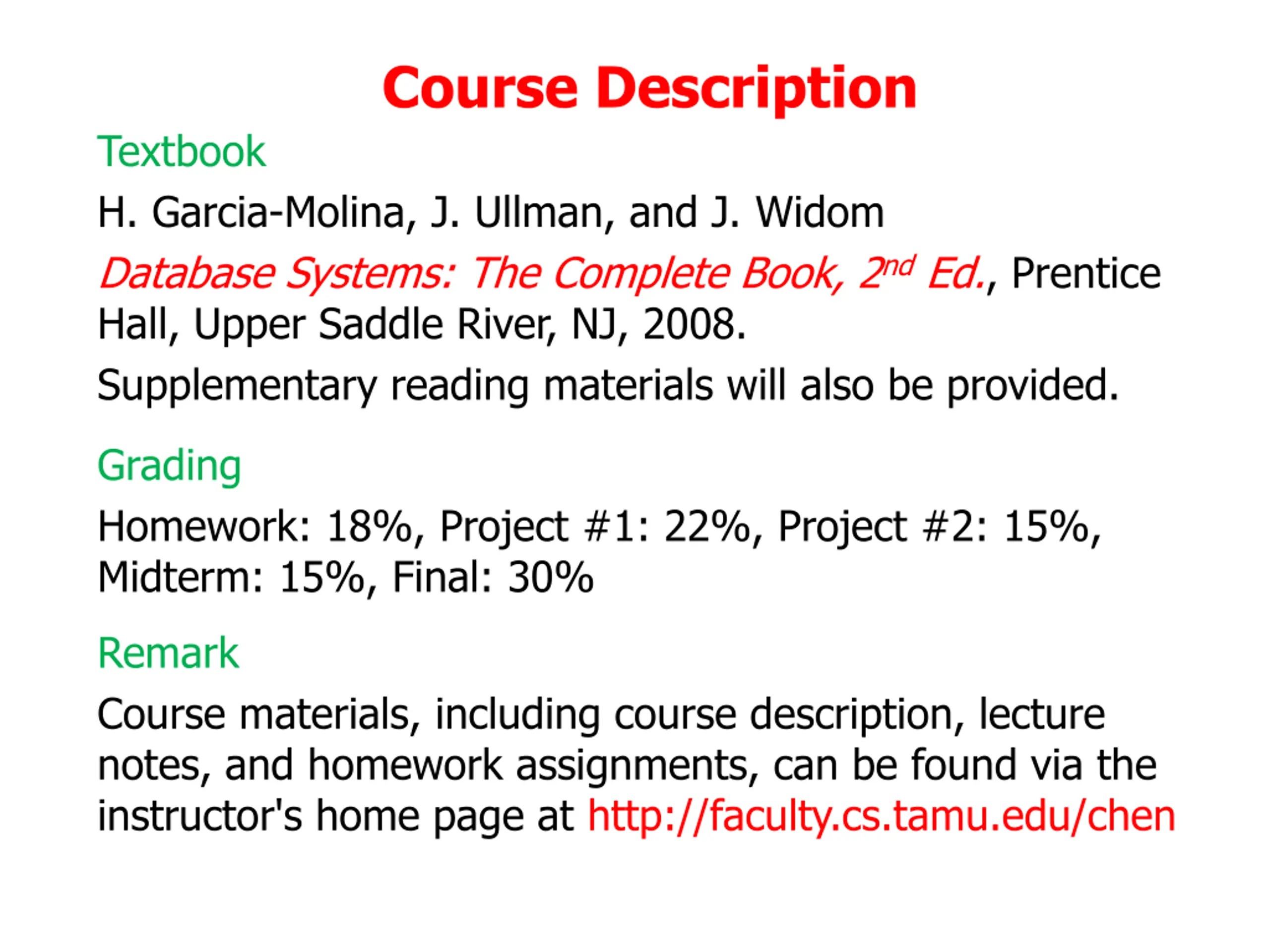 Course Description Textbook H. Garcia-Molina, J. Ullman, and J. Widom Database Systems: The Complete Book, 2nd Ed., Prentice Hall, Upper Saddle River, NJ, 2008. Supplementary reading materials will also be provided. Grading Homework: 18%, Project #1: 22%, Project #2: 15%, Midterm: 15%, Final: 30% Remark Course materials, including course description, lecture notes, and homework assignments, can be found via the instructor's home page at http://faculty.cs.tamu.edu/chen