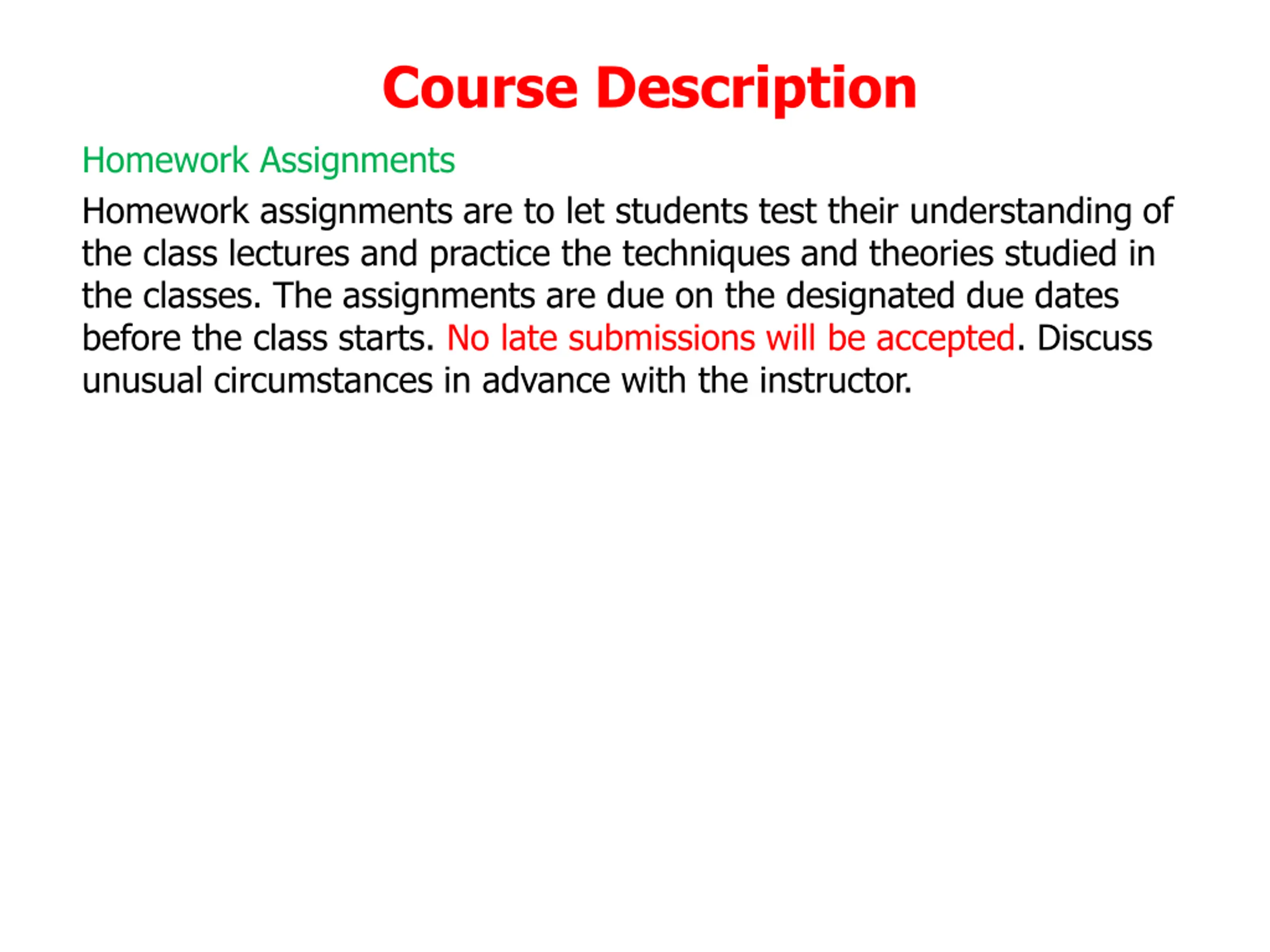 Course Description Homework Assignments Homework assignments are to let students test their understanding of the class lectures and practice the techniques and theories studied in the classes. The assignments are due on the designated due dates before the class starts. No late submissions will be accepted. Discuss unusual circumstances in advance with the instructor.