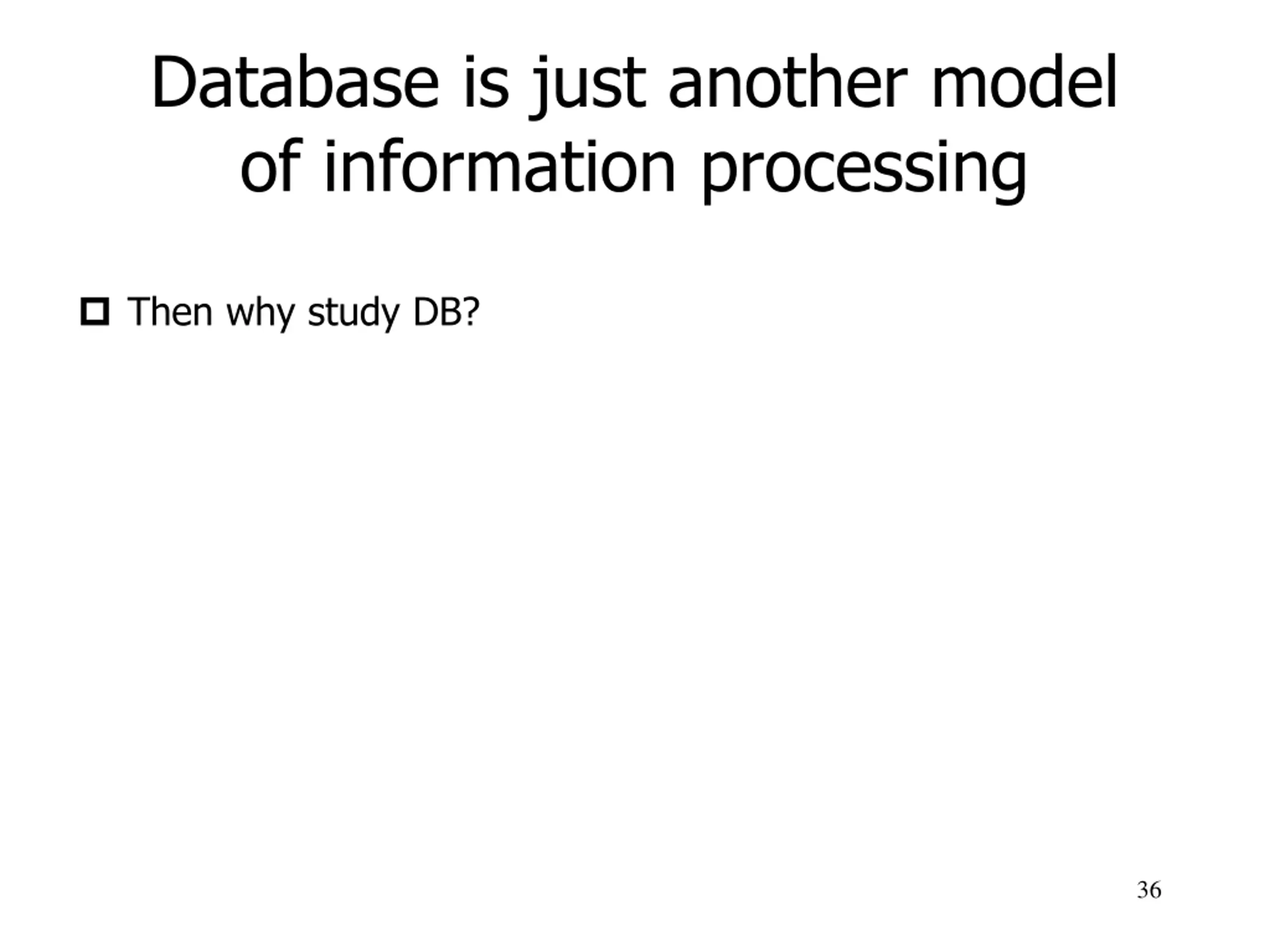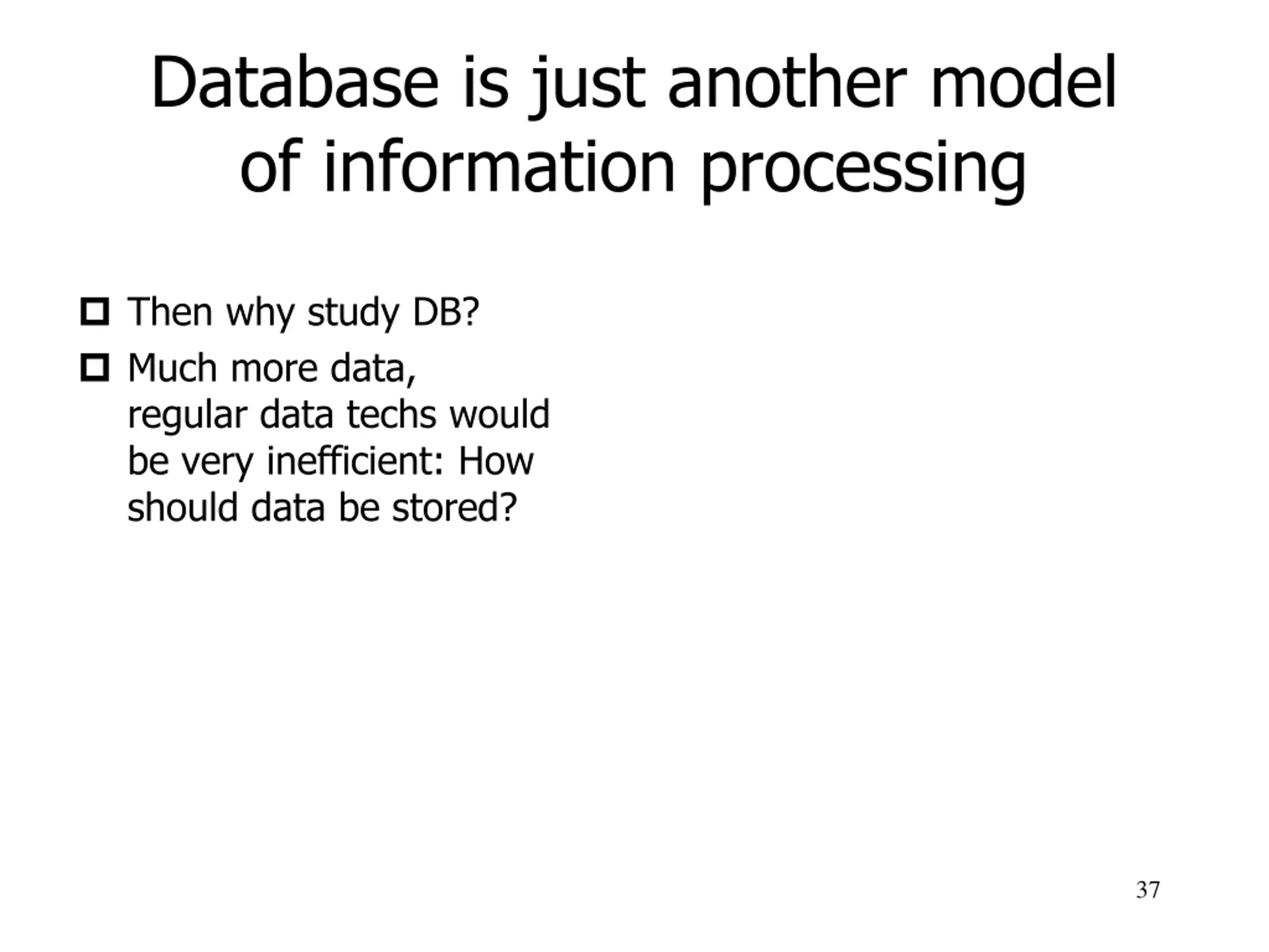 Database is just another model of information processing Then why study DB? Much more data, regular data techs would be very inefficient: How should data be stored? 37