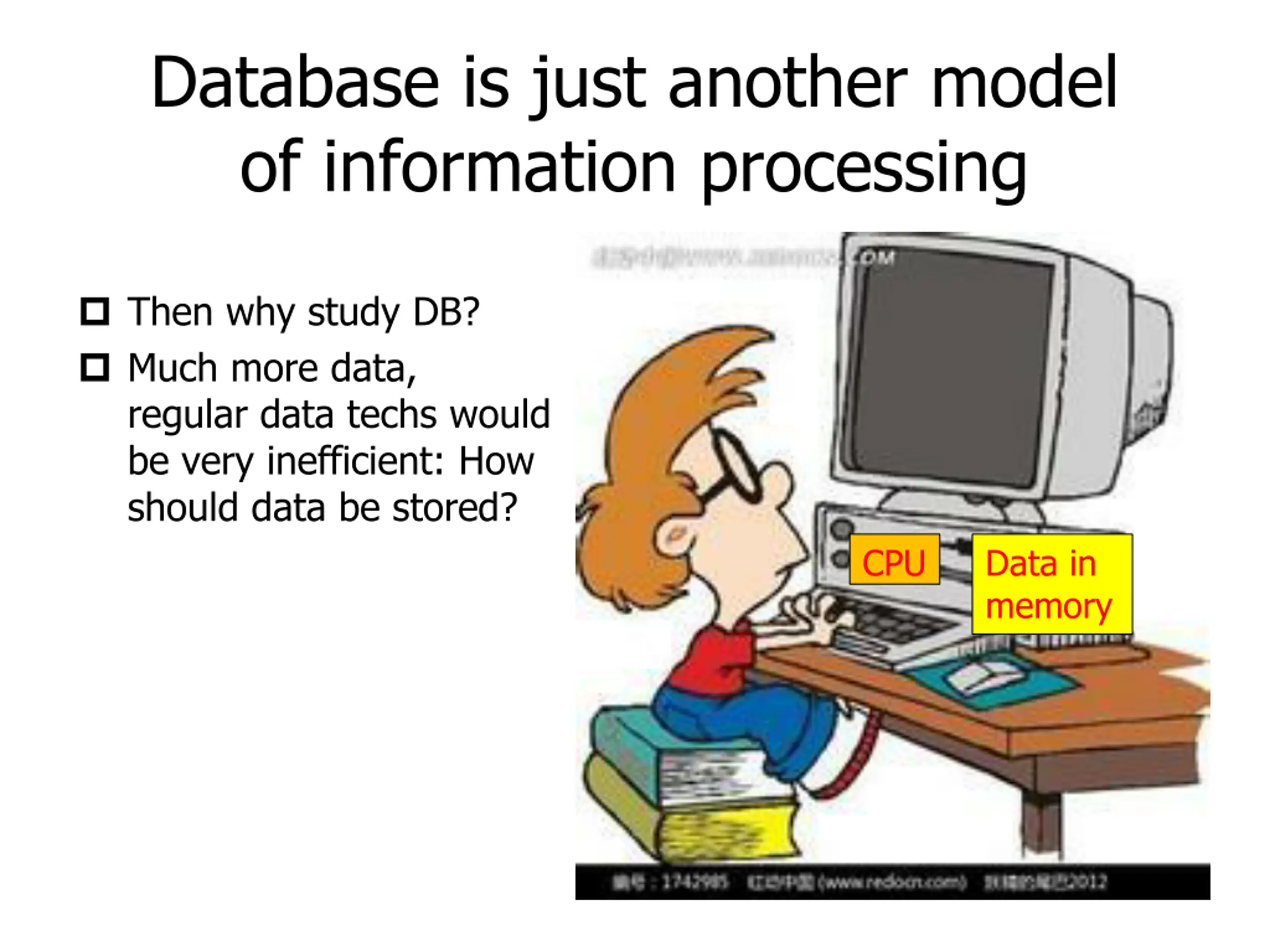 Database is just another model of information processing Then why study DB? Much more data, regular data techs would be very inefficient: How should data be stored? CPU Data in memory 38