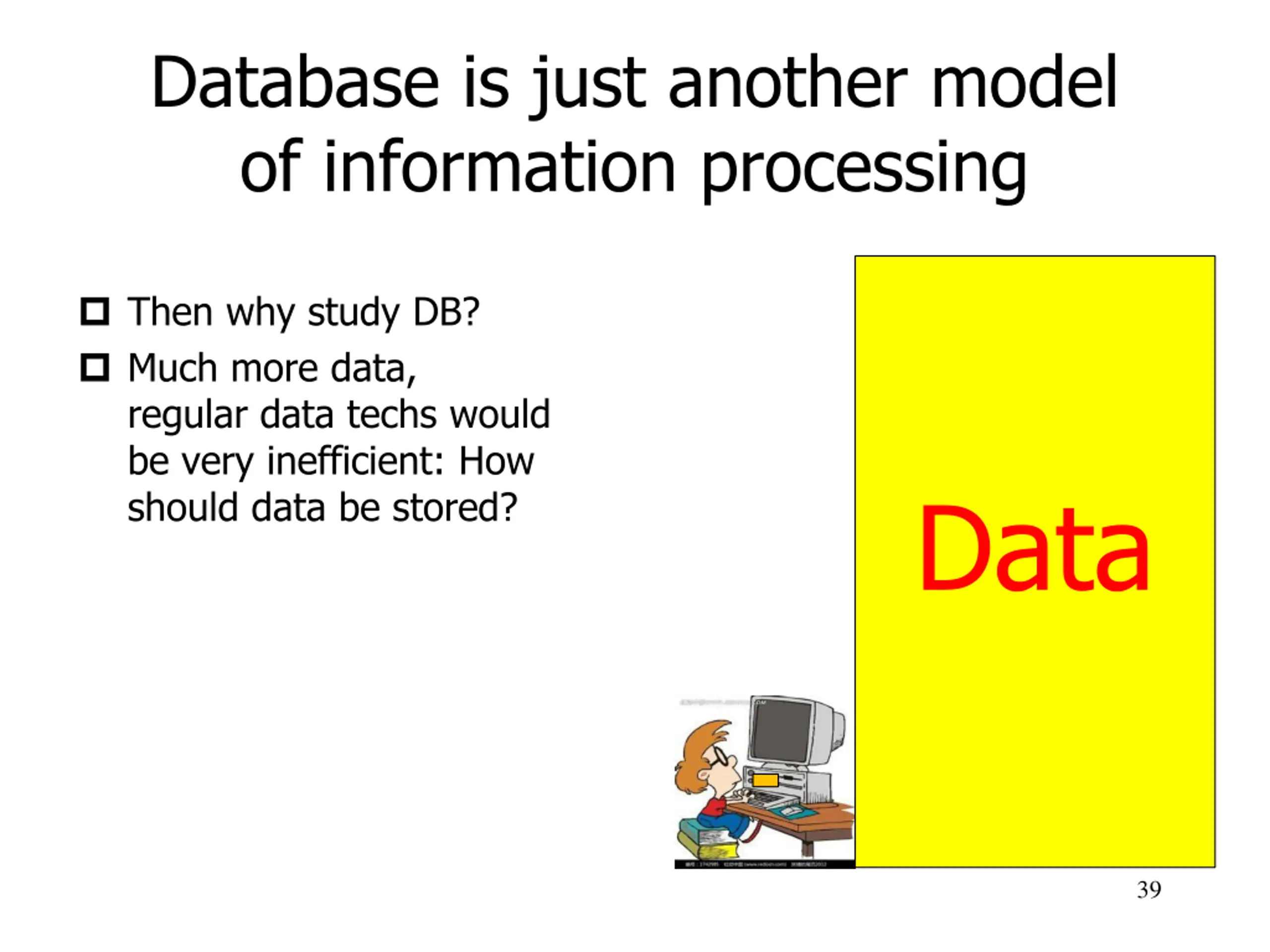 Database is just another model of information processing Then why study DB? Much more data, regular data techs would be very inefficient: How should data be stored? Data 39