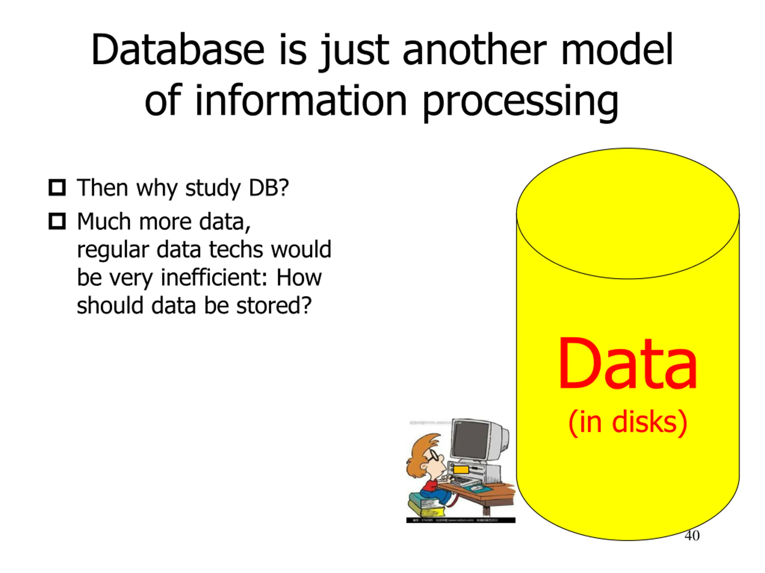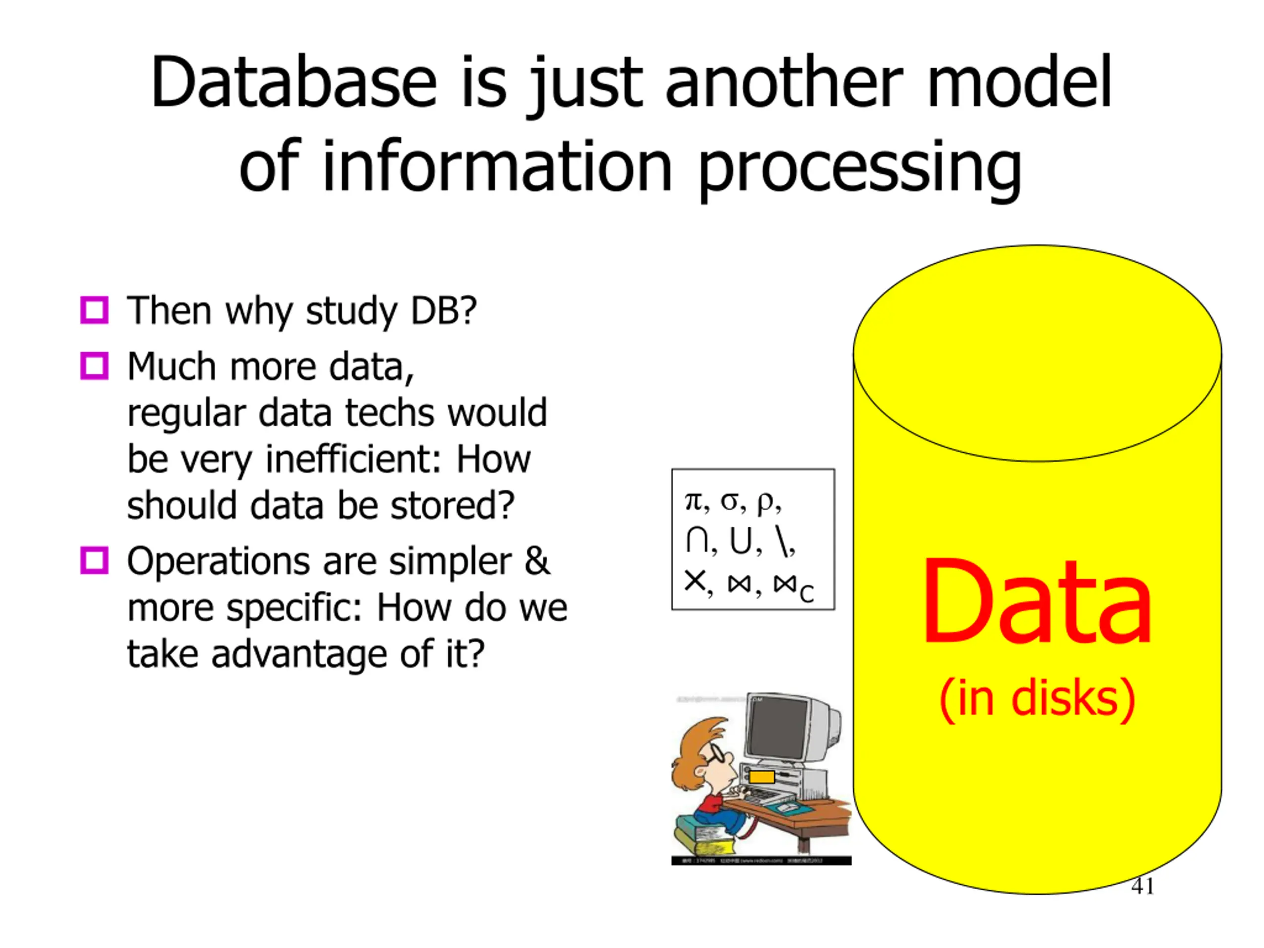 Database is just another model of information processing Then why study DB? Much more data, regular data techs would be very inefficient: How should data be stored? Data (in disks) 40