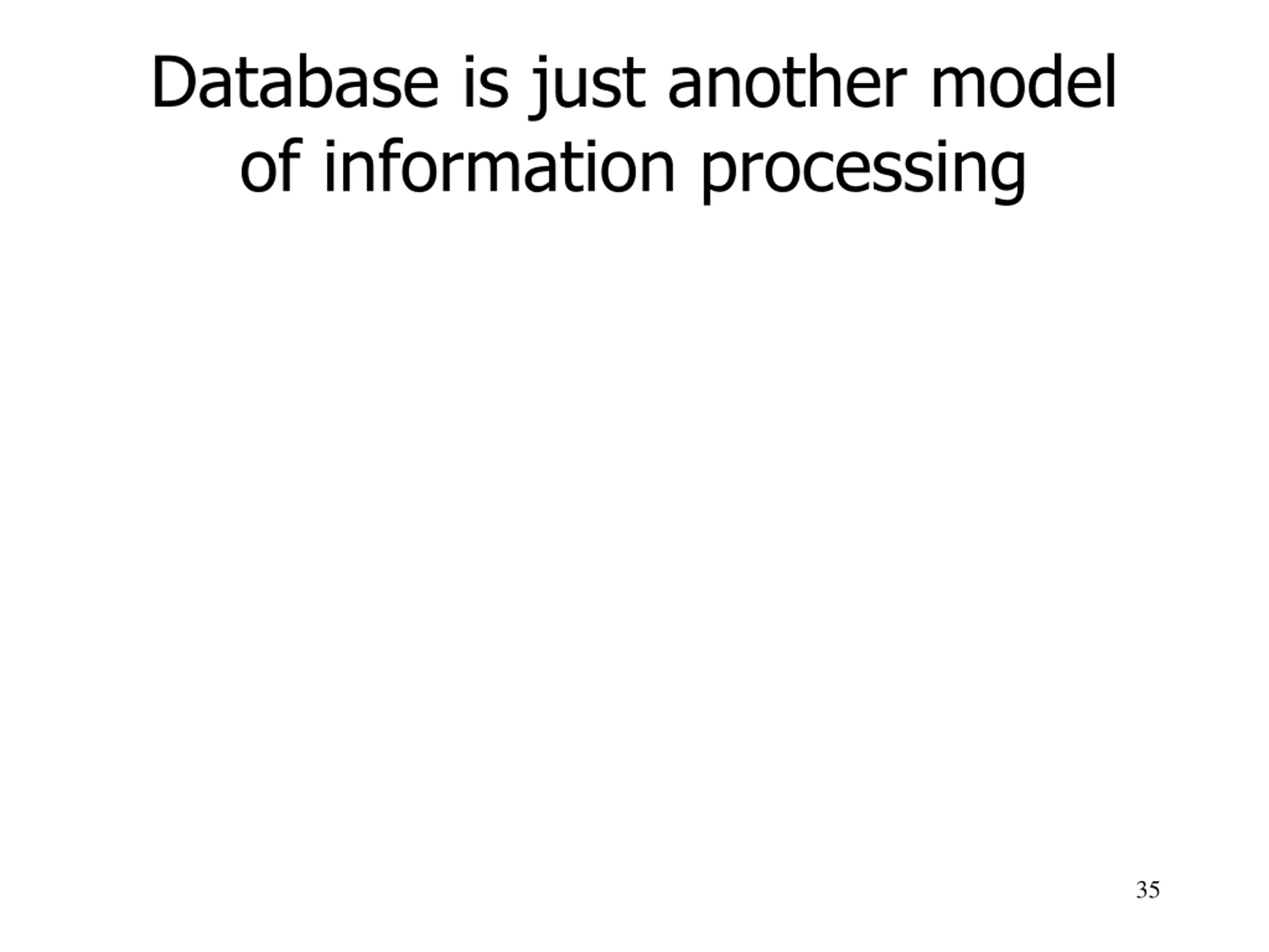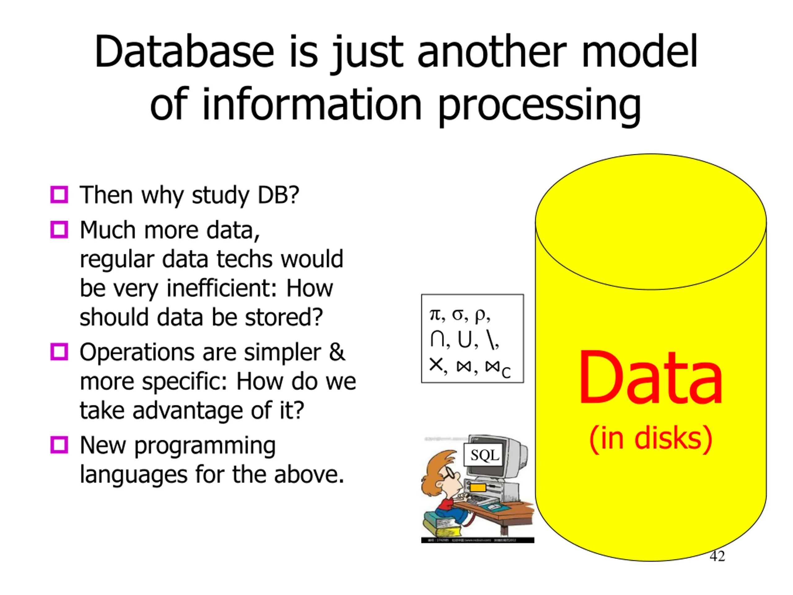 Database is just another model of information processing Then why study DB? Much more data, regular data techs would be very inefficient: How should data be stored? Operations are simpler & more specific: How do we take advantage of it? , , , , , \, , , C Data (in disks) 41