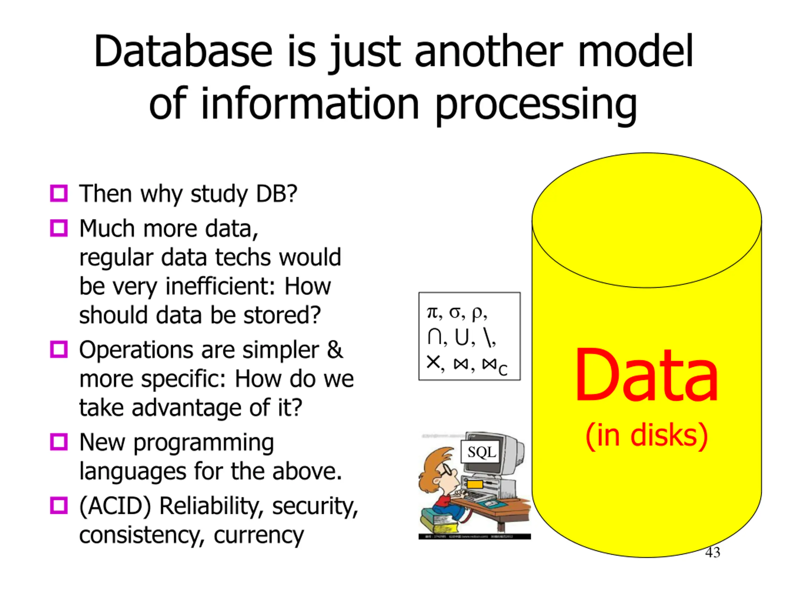 Database is just another model of information processing Then why study DB? Much more data, regular data techs would be very inefficient: How should data be stored? Operations are simpler & more specific: How do we take advantage of it? New programming languages for the above. (ACID) Reliability, security, consistency, currency , , , , , \, , , C Data (in disks) SQL 43
