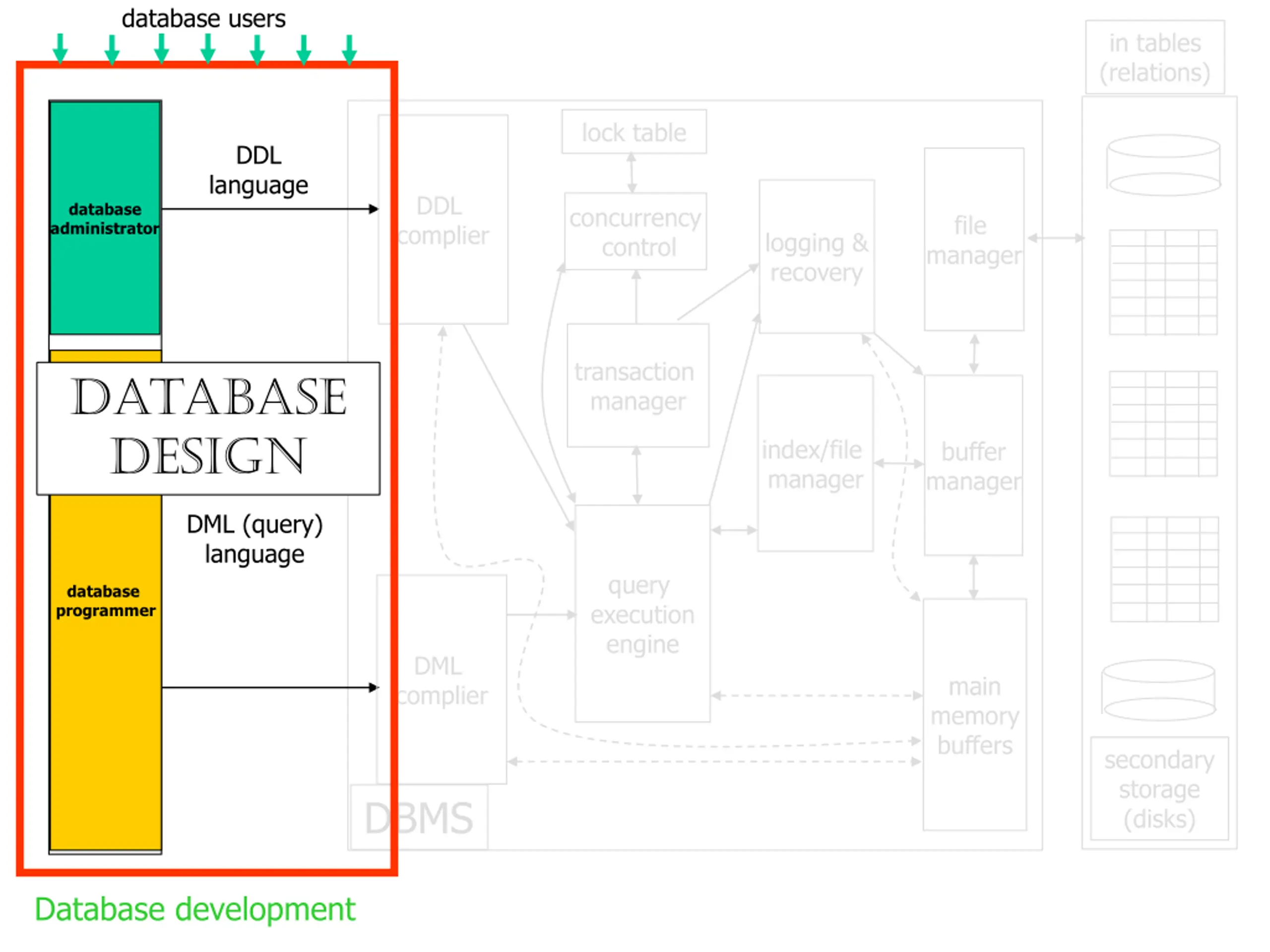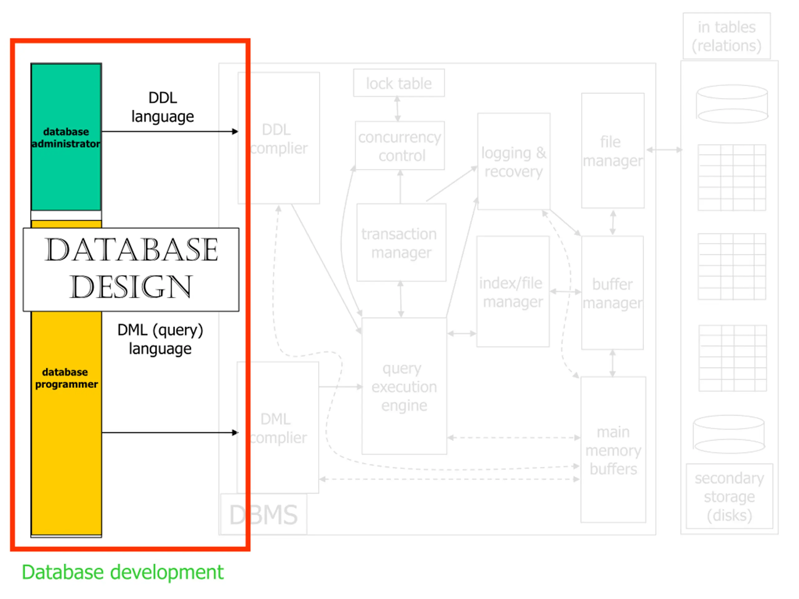 database users in tables (relations) lock table DDL language DDL complier database administrator concurrency control file logging & recovery manager transaction manager Database Design index/file manager buffer manager DML (query) language query execution engine database programmer DML complier main memory buffers secondary storage (disks) DBMS Database development